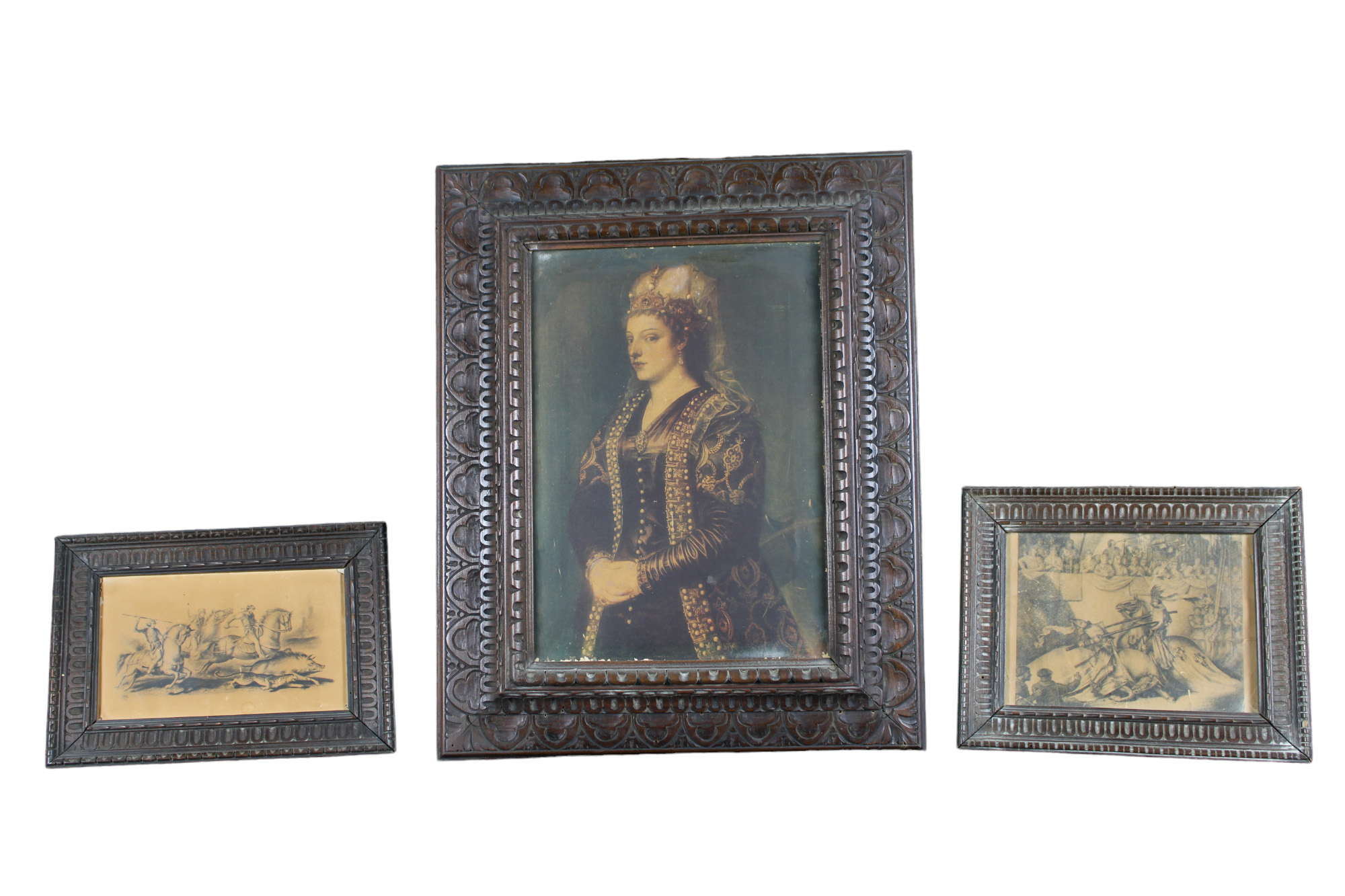 LOTTO DI 3 CORNICI DI GUSTO RINASCIMENTALE in legno scolpito contenenti stampe Sicilia primi 900 h cm 55 x 45 / h cm 24 x 30 / h cm 22 x 31