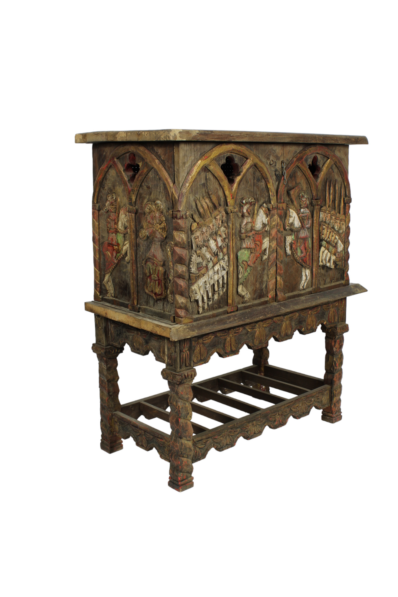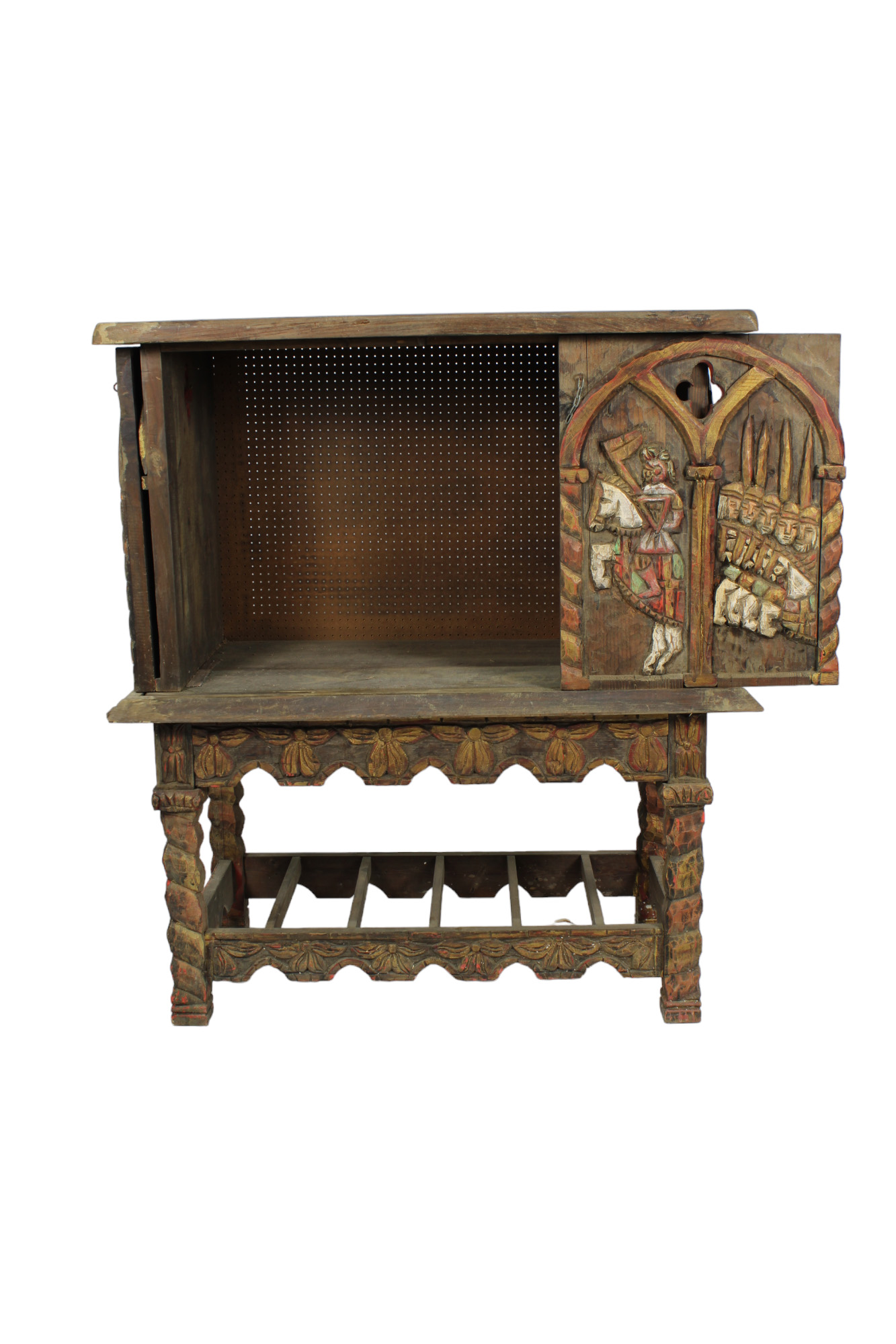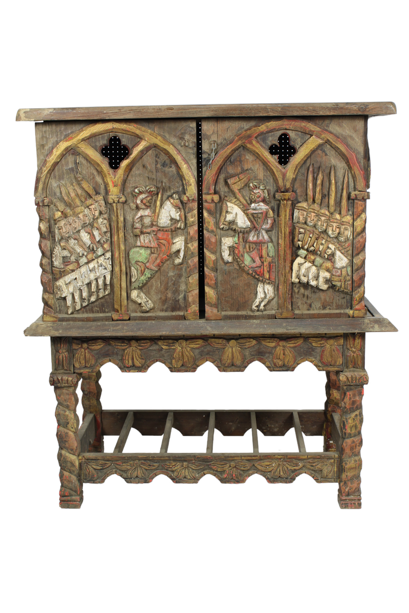 MOBILE A DOPPIO CORPO in legno scolpito e dipinto di gusto etnico fine XIX secolo h cm 117 x 104 x 55,5