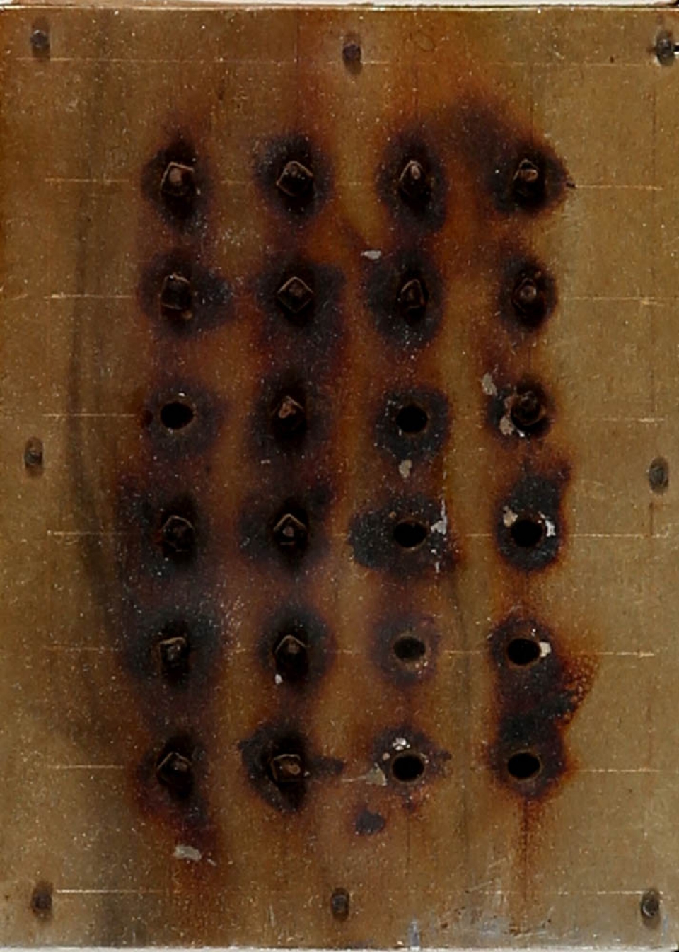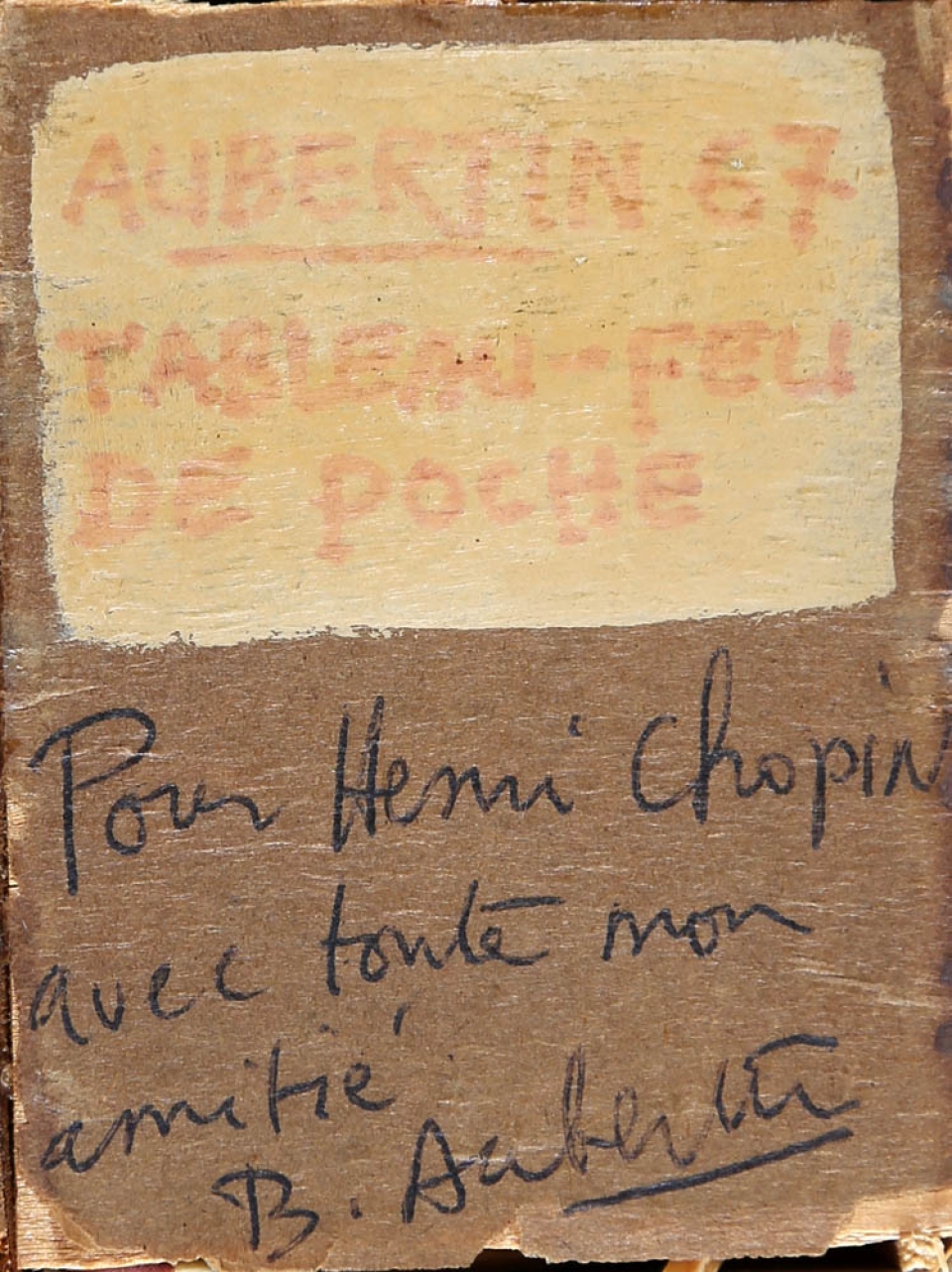 BERNARD AUBERTIN 1934 " Tableau - feu de poche ", 1967 Assembalggio, legno, ferro e fiammiferi bruciati, cm. 8 x 5,7 x 5 Firmato e datato sul retro Dedica dell'artista a Henri Chopin sul retro Autentica dell'artista su fotografia Prov. Collezione Privata