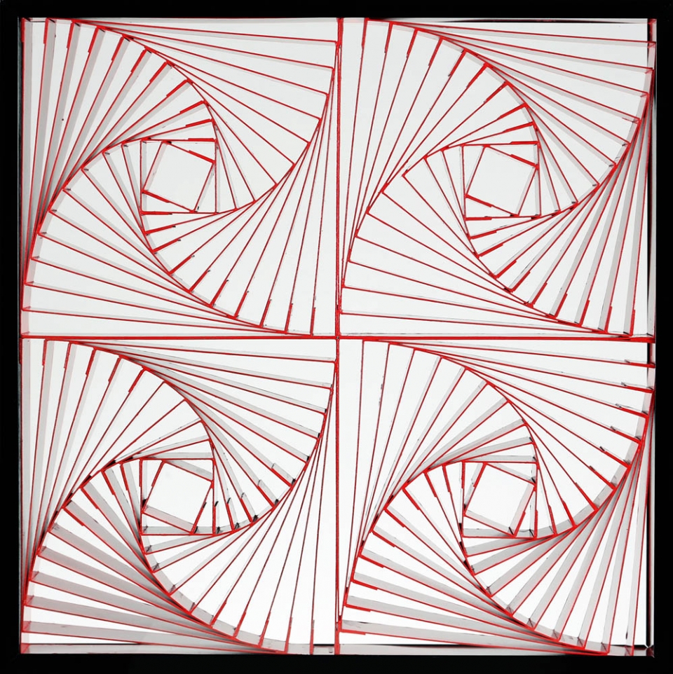 MANFREDO MASSIRONI 1937 - 2011 " Struttura a quadrati rotanti, cartoncino rosso ", 1964 Cartoni colorati in teca plexiglass con cornice in alluminio, cm. 50 x 50 x 5 Autentica dell'artista su fotografia Prov. Collezione Privata