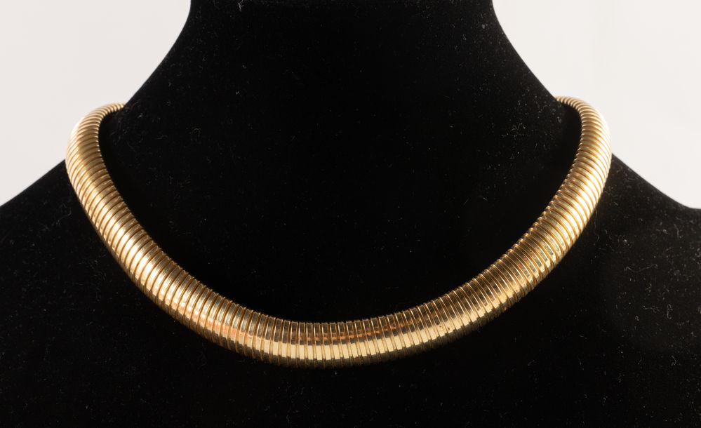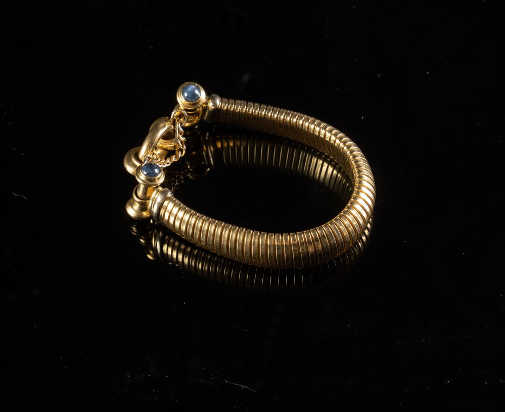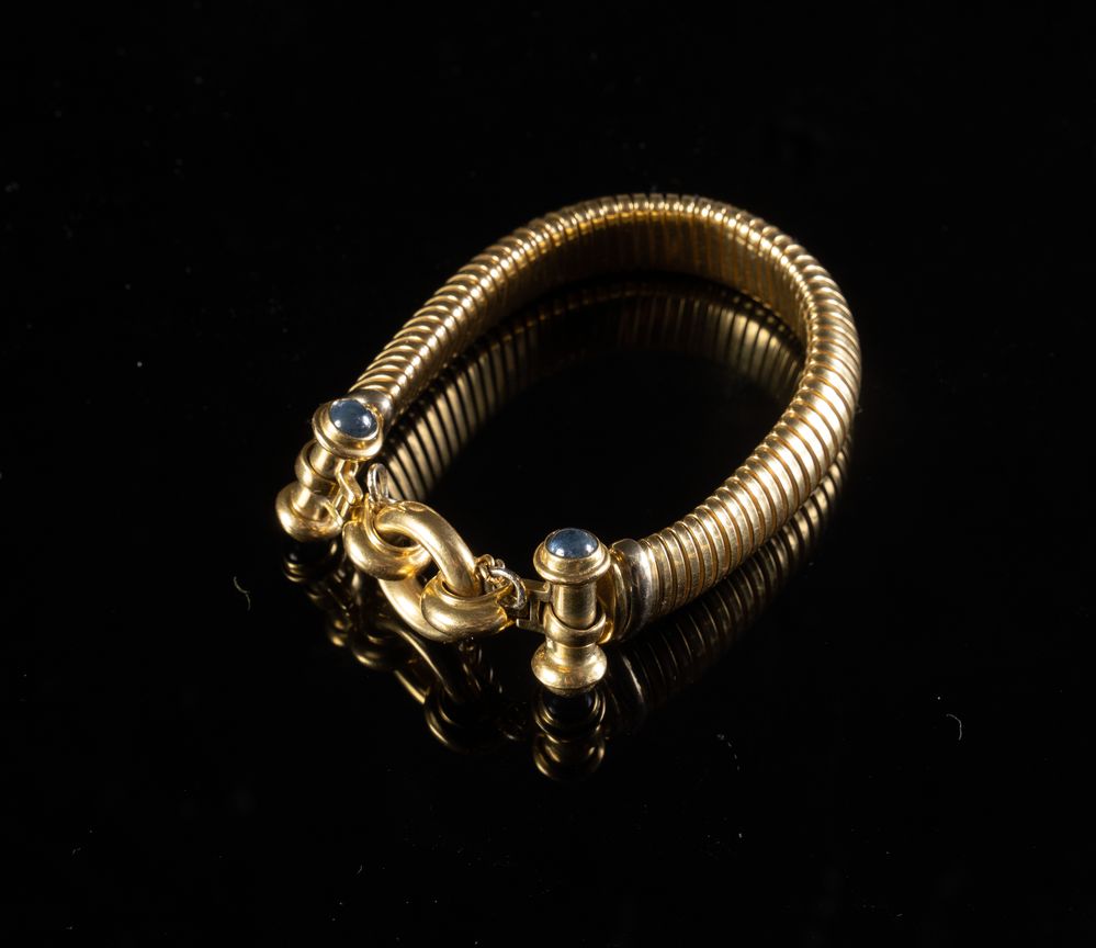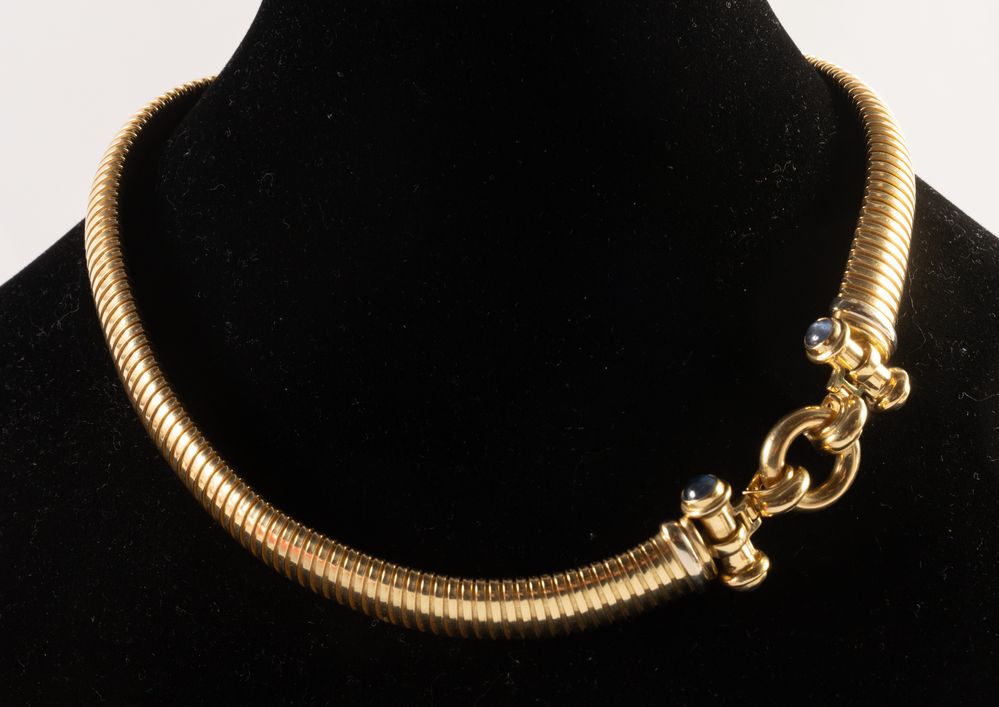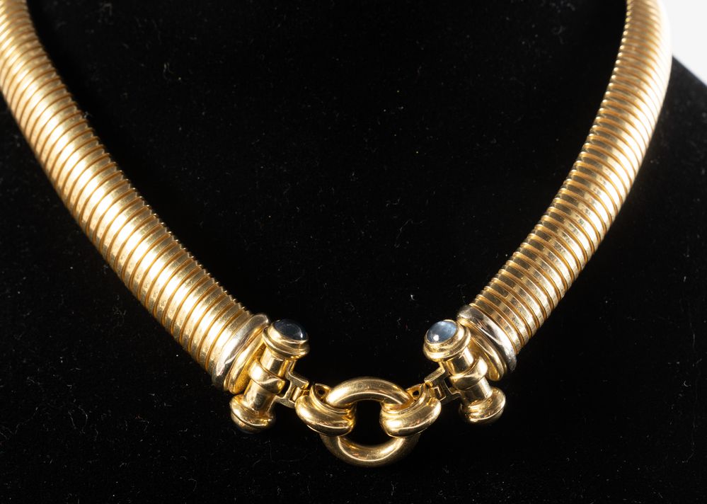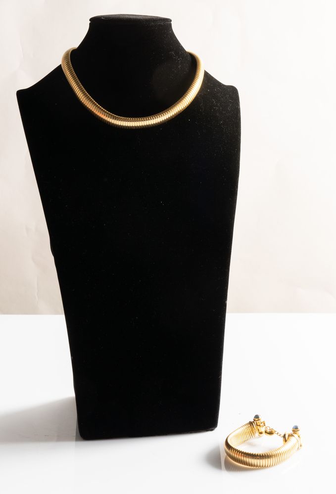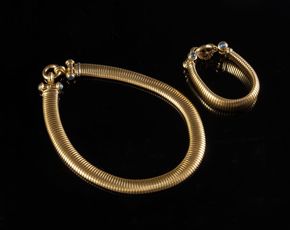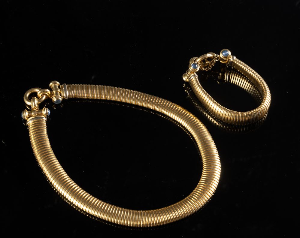 Costituita da bracciale e collana in oro giallo 18k con inserti di pietra a taglio cabochon. Chiusura a guisa di lucchetto. Peso complessivo: 108,60 grammi.