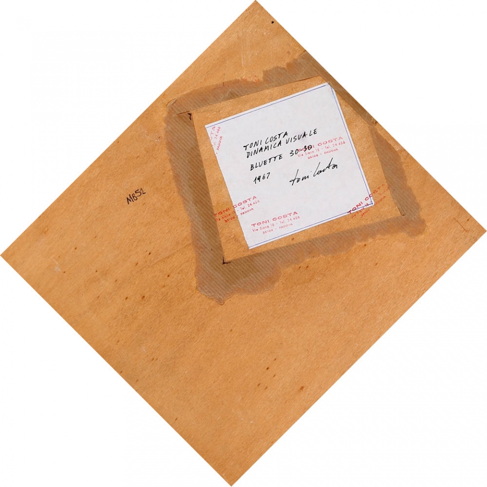 TONI COSTA 1935 - 2013 " Dinamica visuale ", 1967 Tecnica mista su tela, cm. 30 x 30 Firmato e datato sul retro Timbro dell'artista sul retro Autentica dell'artista su fotografia Timbro Archivio Toni Costa su fotografia Prov. Collezione Privata