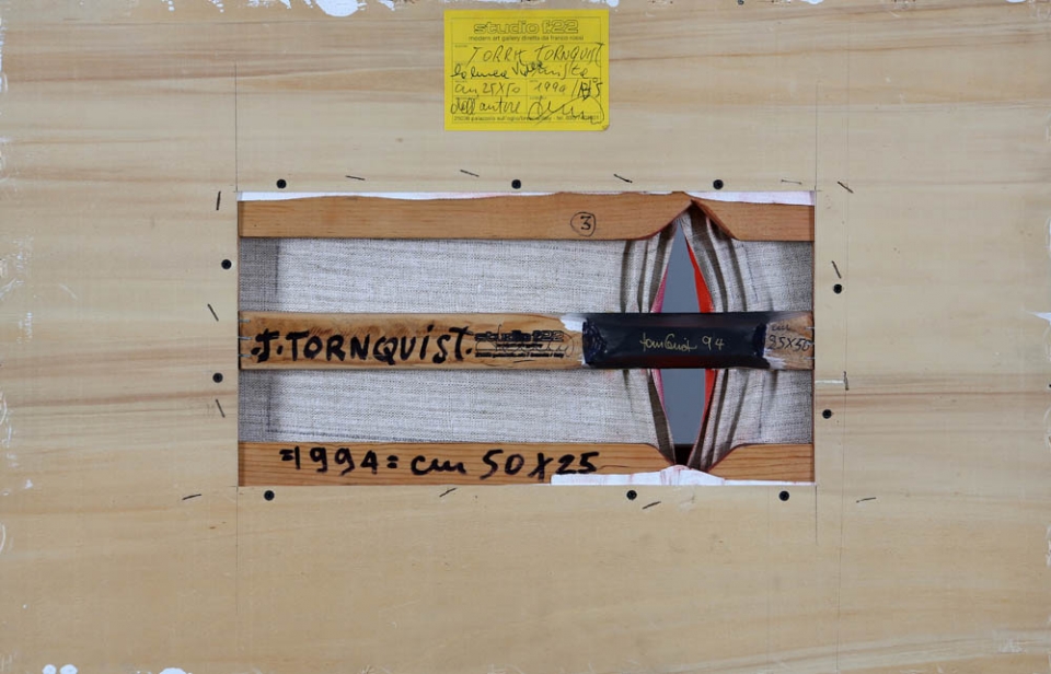 JORRIT TORNQUIST 1938 " La linea viola ", 1994 Tecnica mista su tela, cm. 25 x 50 Firmato e datato sul retro Etichetta Studio F22 Palazzolo, sul retro Prov. Collezione Privata
