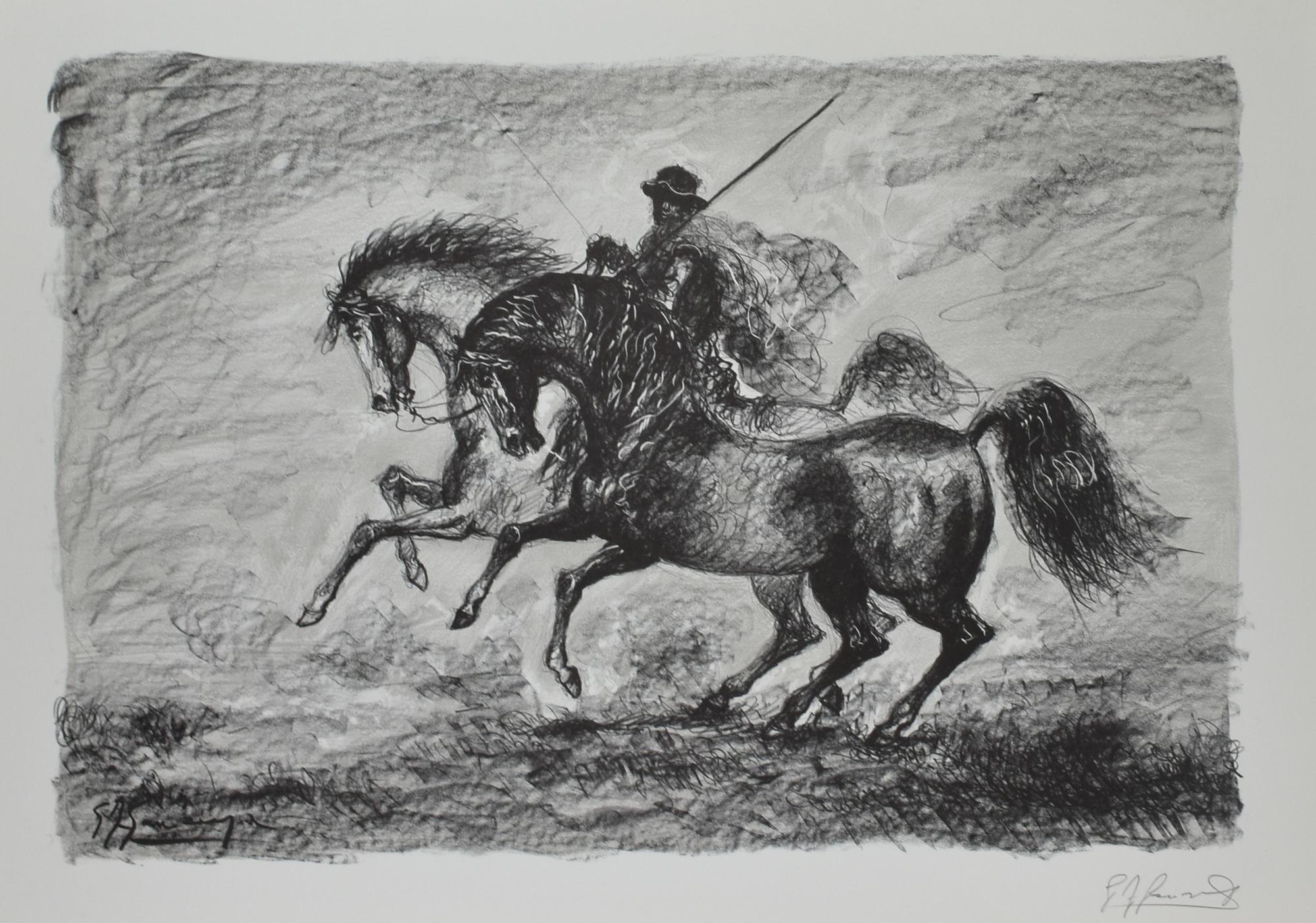 Giovan Francesco Gonzaga UOMINI E CAVALLI litografia su carta, cm 59x83; es....