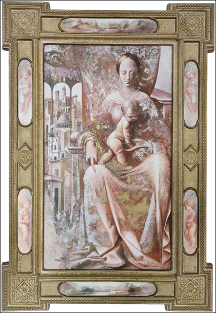 MARCHIONNI ELVIO Spello 1944 "Maternità rosa" Creazione originale polimaterica a tecnica mista, litografica e serigrafica, su cartone "Scholler", con applicazione manuale di foglia d'argento, foglia d'oro e terre naturali, cm 72x42 in 28 colori. La cornice è parte integrante dell'opera. Firmata sul fronte in basso a destra, tiratura 128/195 a sinistra. Certificato di autenticità a cura di ART'E' SpA.