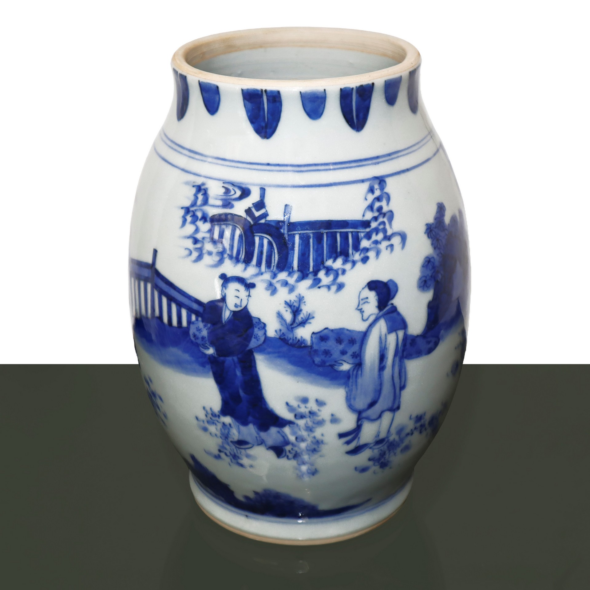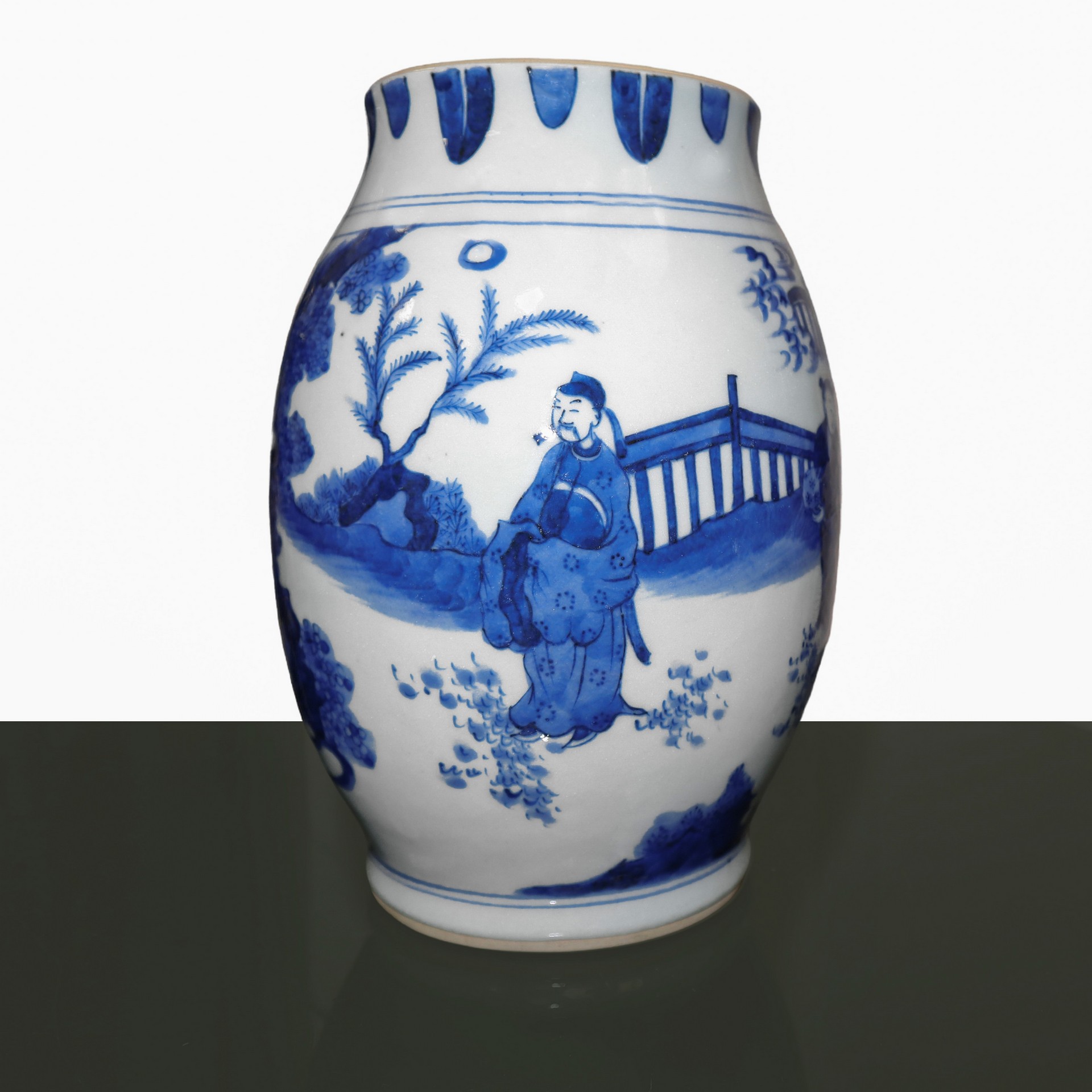 Vaso nei toni del bianco e del blu con scene di genere e paesaggio con cascata, 17° secolo h cm 24 x 12