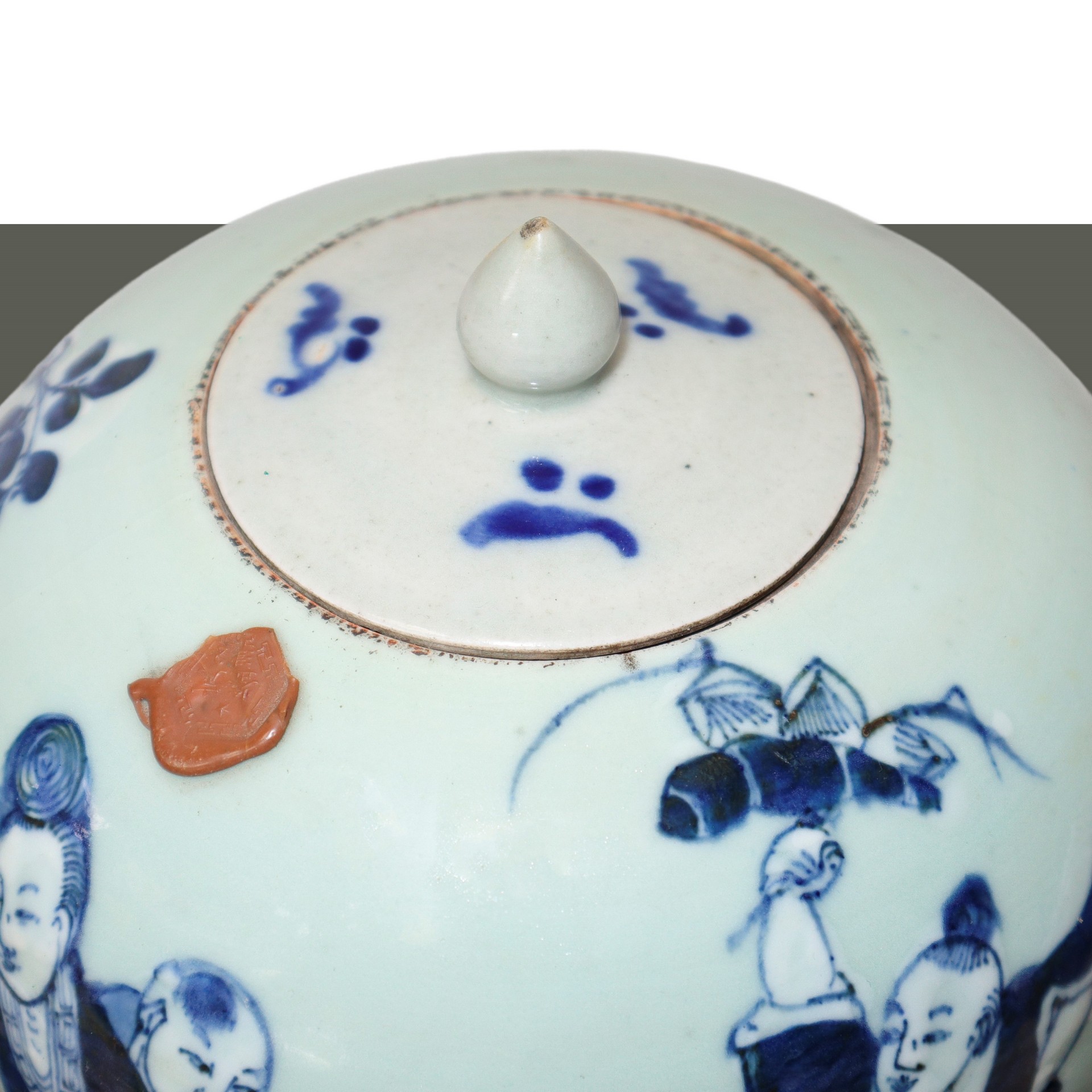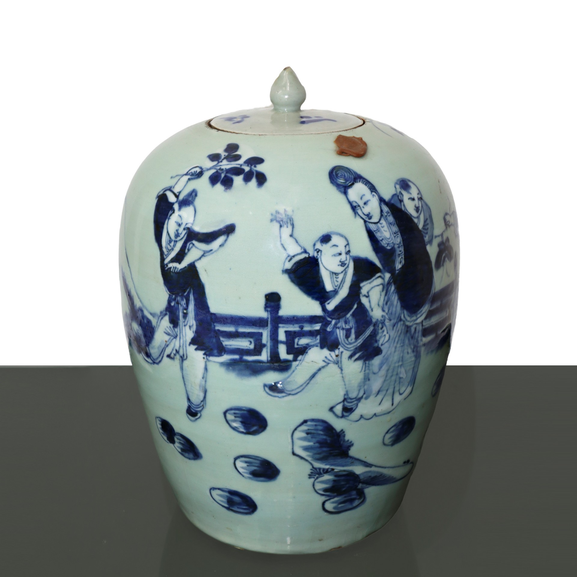 Grande urna cinese in porcellana con coperchio, nineteen° secolo H cm 30.5x22.5 Grande urna cinese in ceramica, sfondo con colore verde acqua, decorazione con una scena in cui sono presenti dei bambini e una donna in abiti e acconciature orientali. Coperchio con pomello di forma conica arrotondata. Base in legno incisa. Timbro di cera lacca nella parte superiore vicino alla testa della donna. Adesivo "ASIA IMPORT, Sircusa".Grande urna cinese in ceramica, sfondo con colore verde acqua, decorazione con una scena in cui sono presenti dei bambini e una donna in abiti e acconciature orientali. Coperchio con pomello di forma conica arrotondata. Base in legno incisa. Timbro di cera lacca nella parte superiore vicino alla testa della donna. Adesivo "ASIA IMPORT, Sircusa".