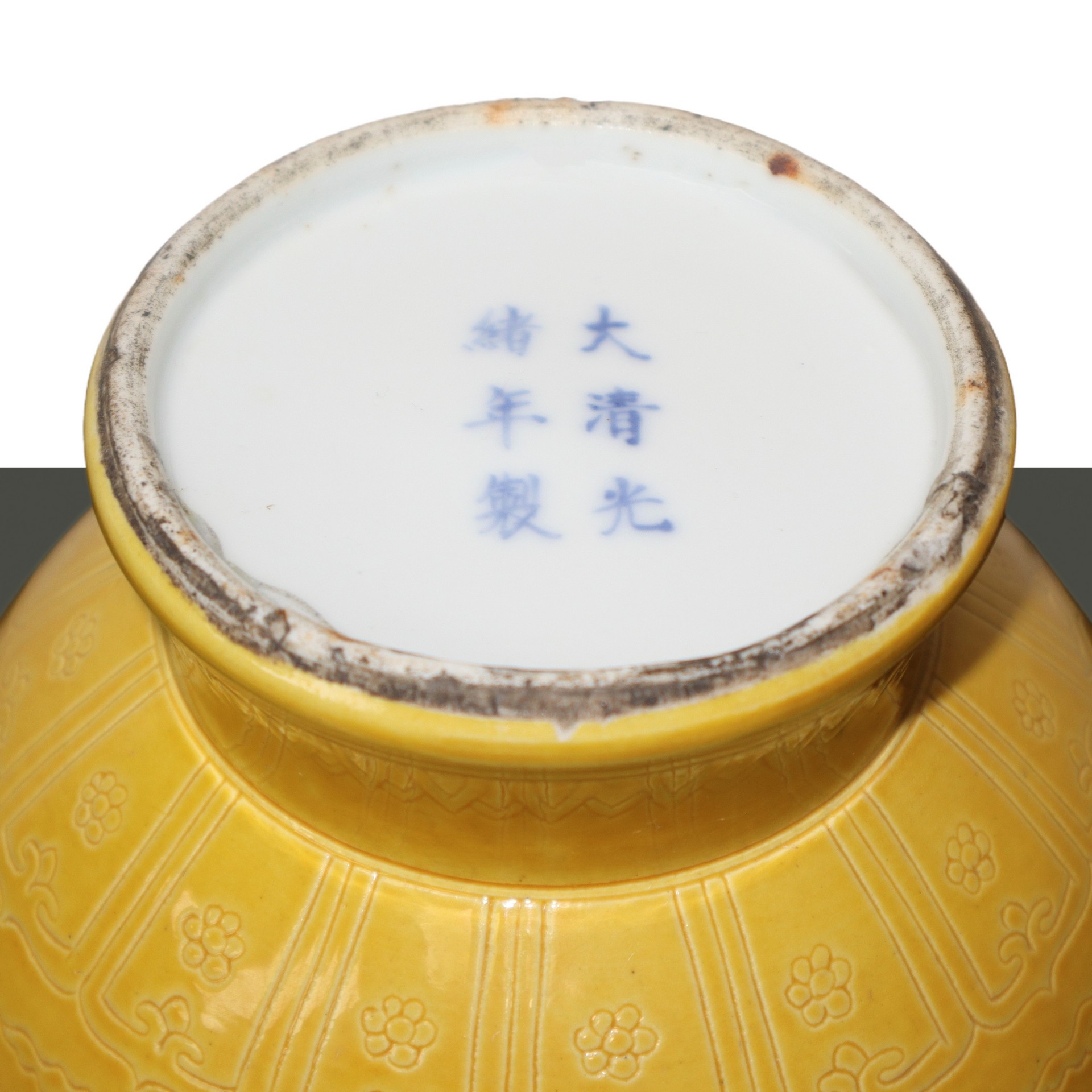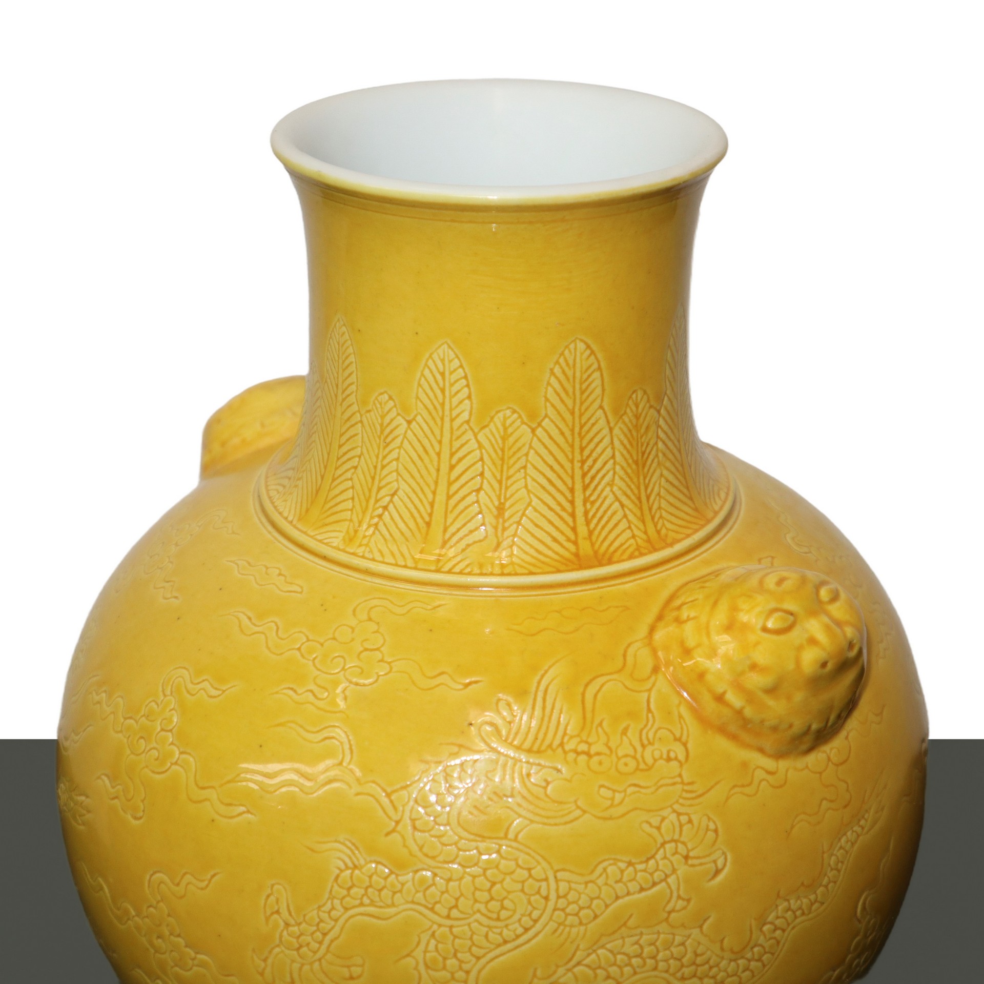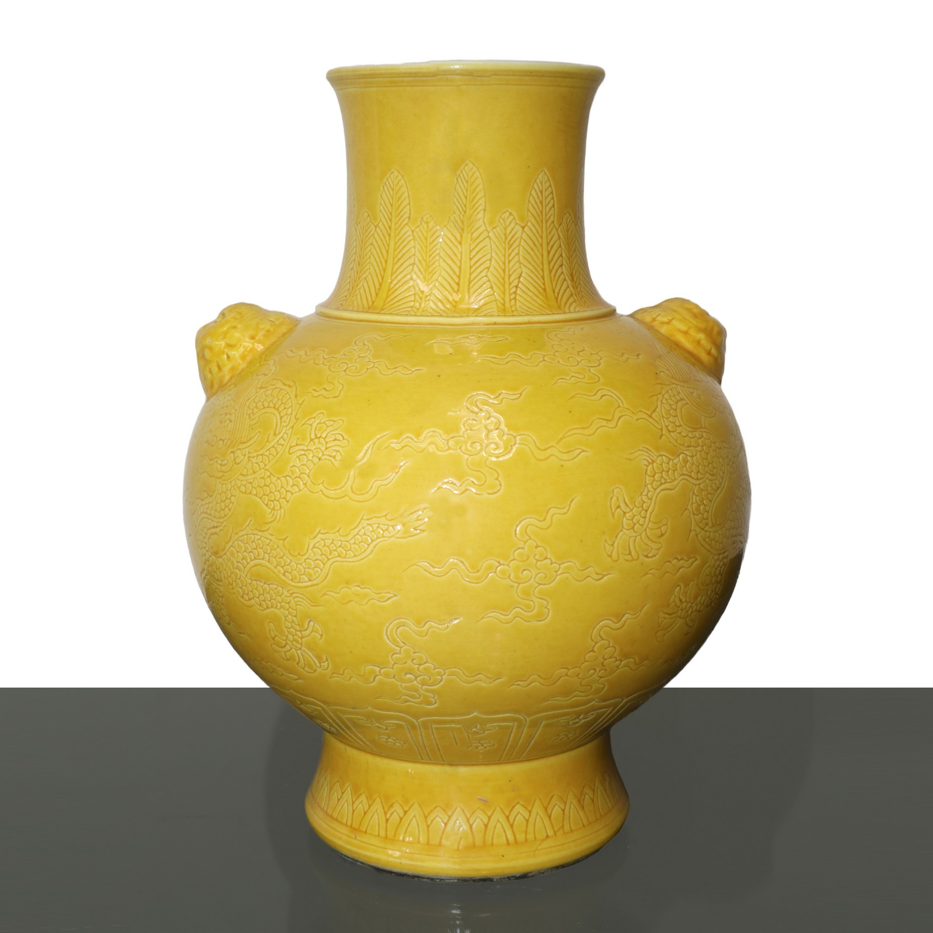 Vaso cinese in ceramica gialla con incisioni di draghi, dinstia Quinq, periodo Guanxu