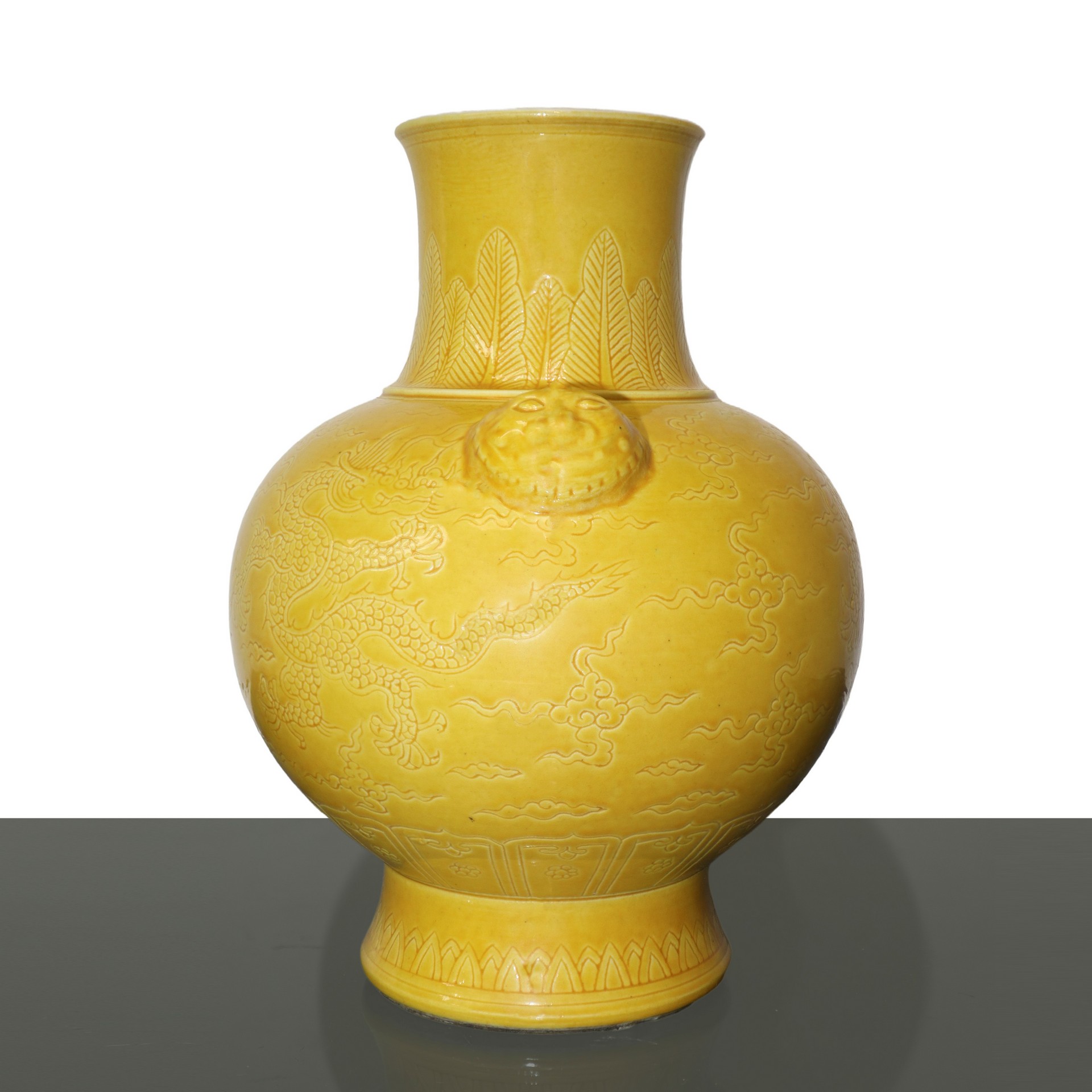 Vaso cinese in ceramica gialla con incisioni di draghi, dinstia Quinq, periodo Guanxu H cm 21,5x15,5 Firma sul fondo.Firma sul fondo.