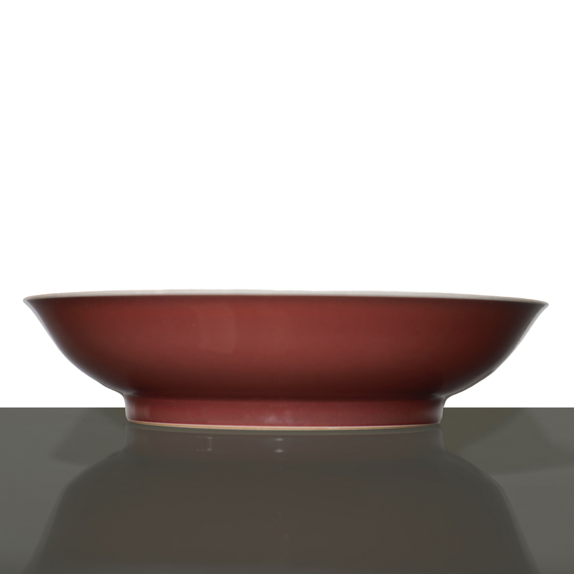 Piatto con alzata “SANG DE BEOUF ”, Qing Dynasty h cm 4.4 x 19 Sul fondo marchio Da Qing Kang Xi Nian ZhiSul fondo marchio Da Qing Kang Xi Nian Zhi
