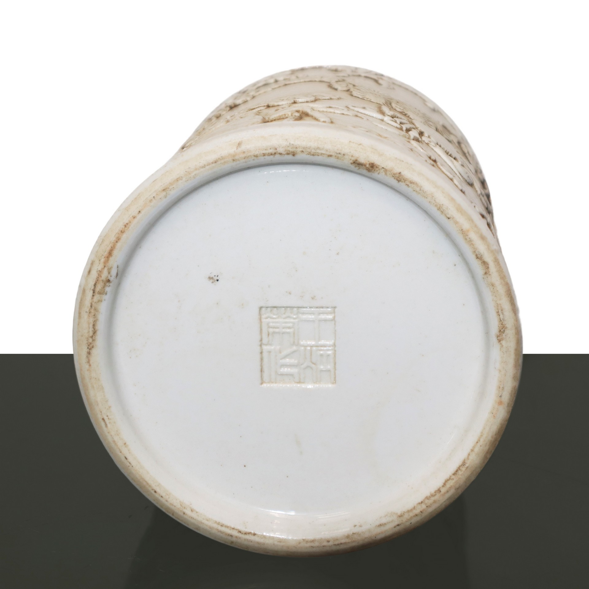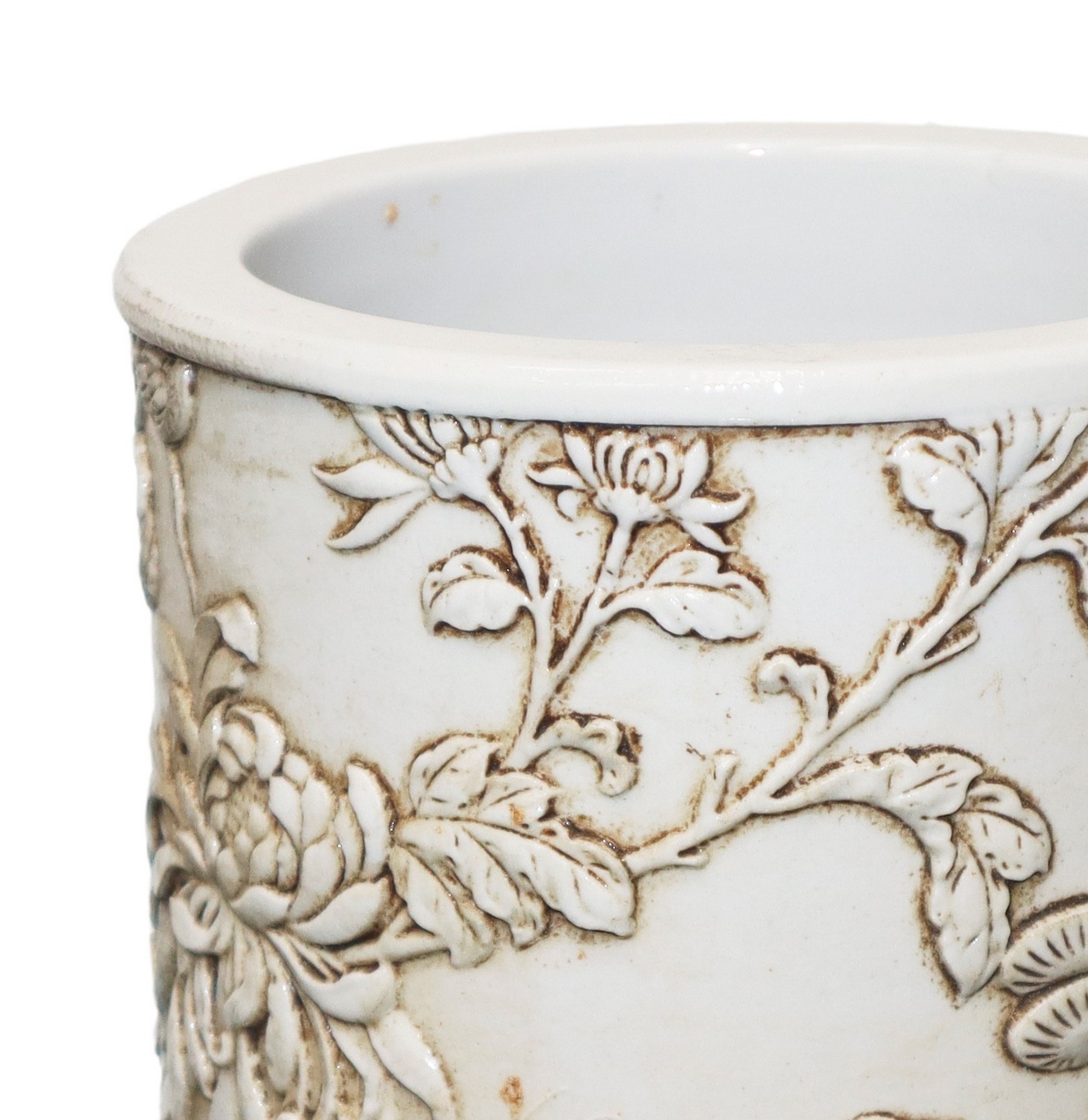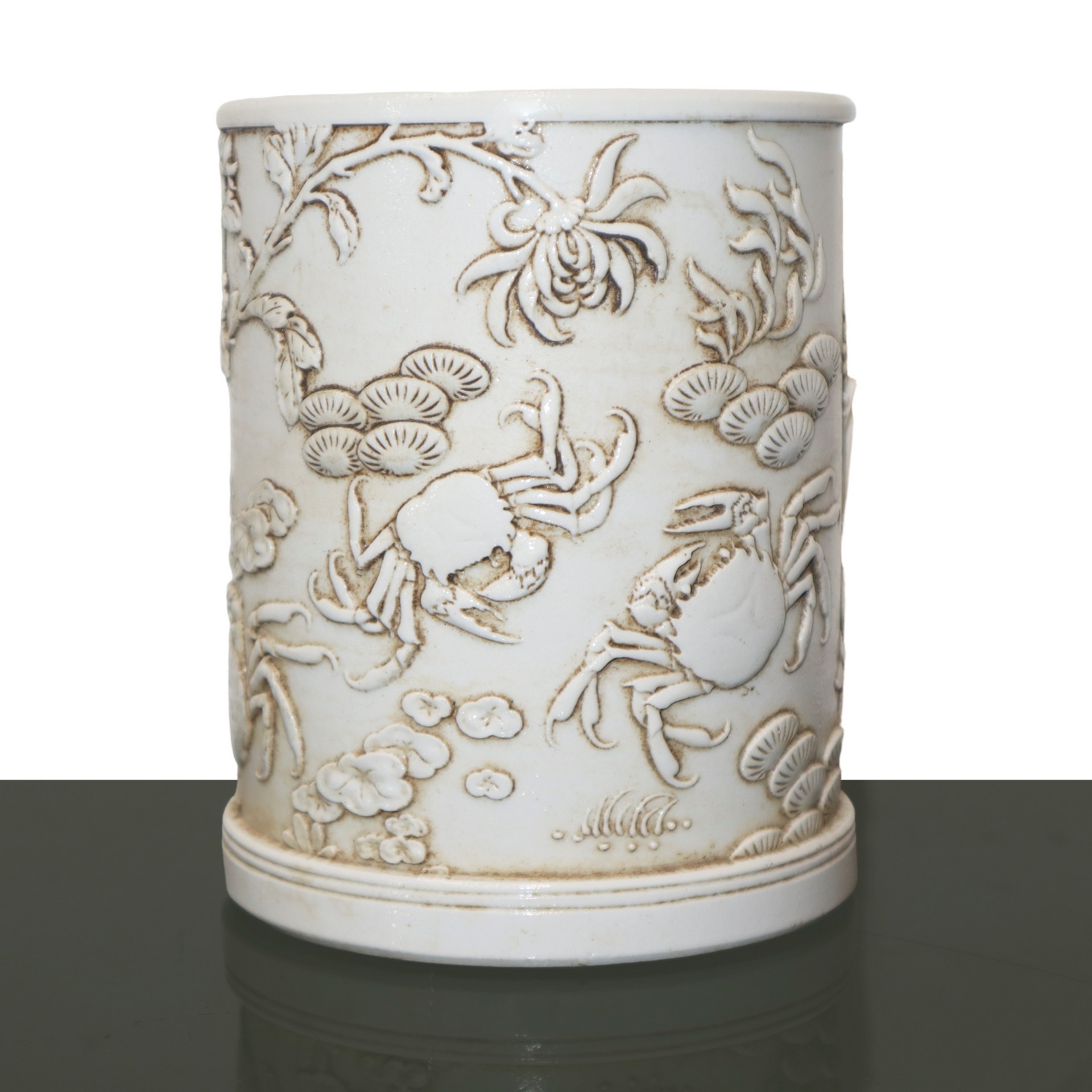 Portapennelli scolpito con raffigurazioni di granchi conciglie e fiori, Bitong 19° secolo H cm 14 x 11 Nei toni del biancoNei toni del bianco