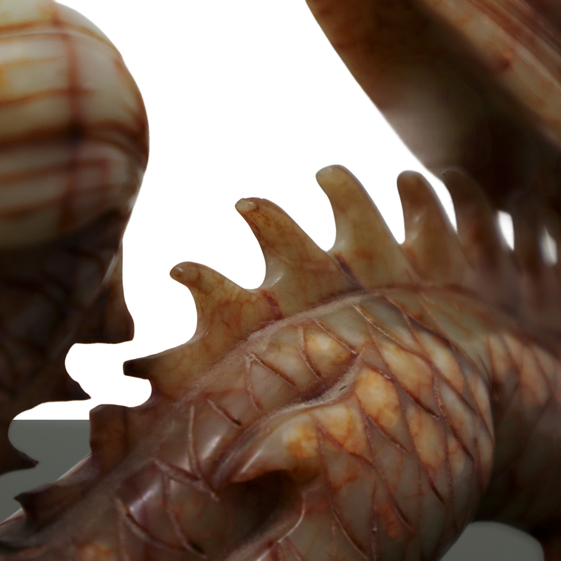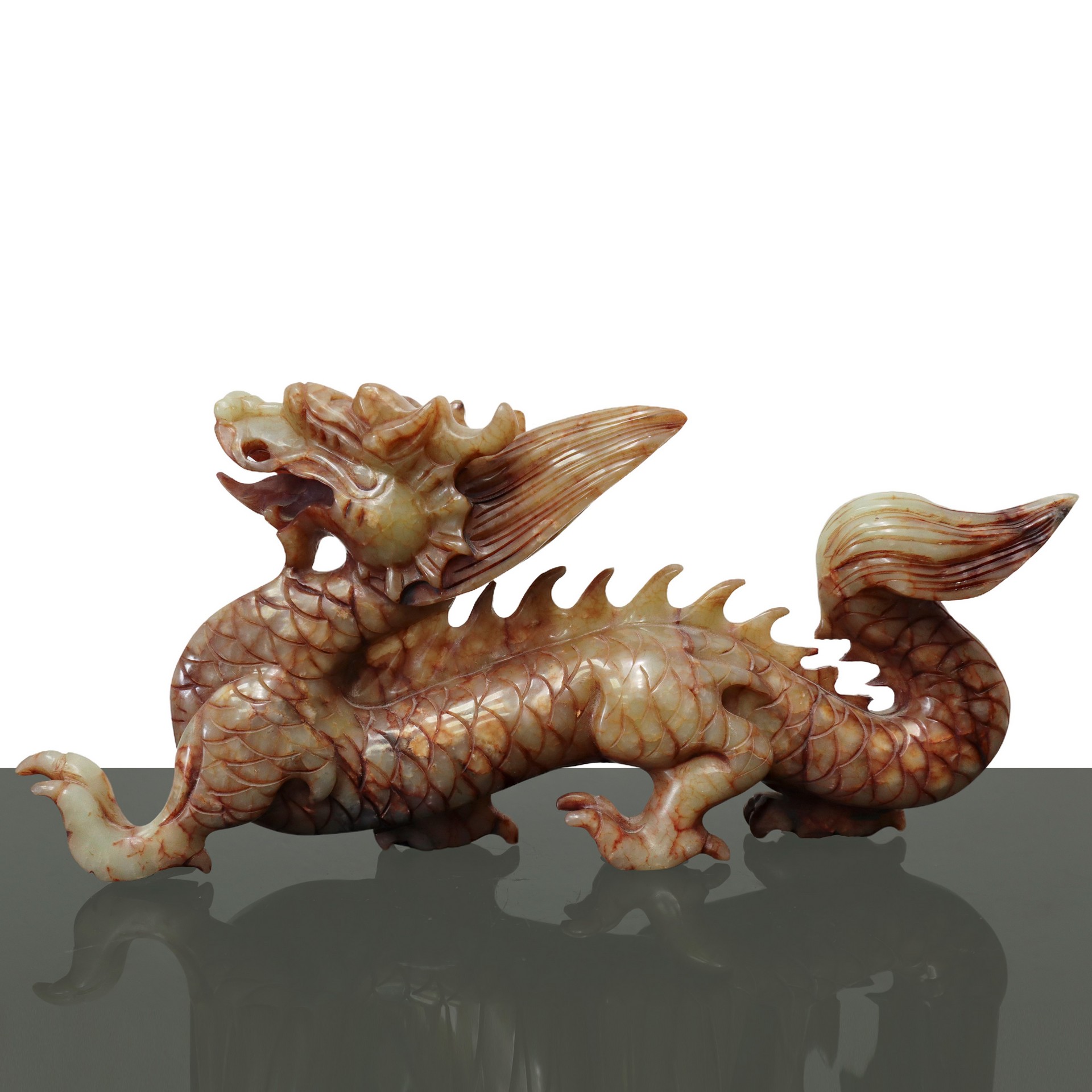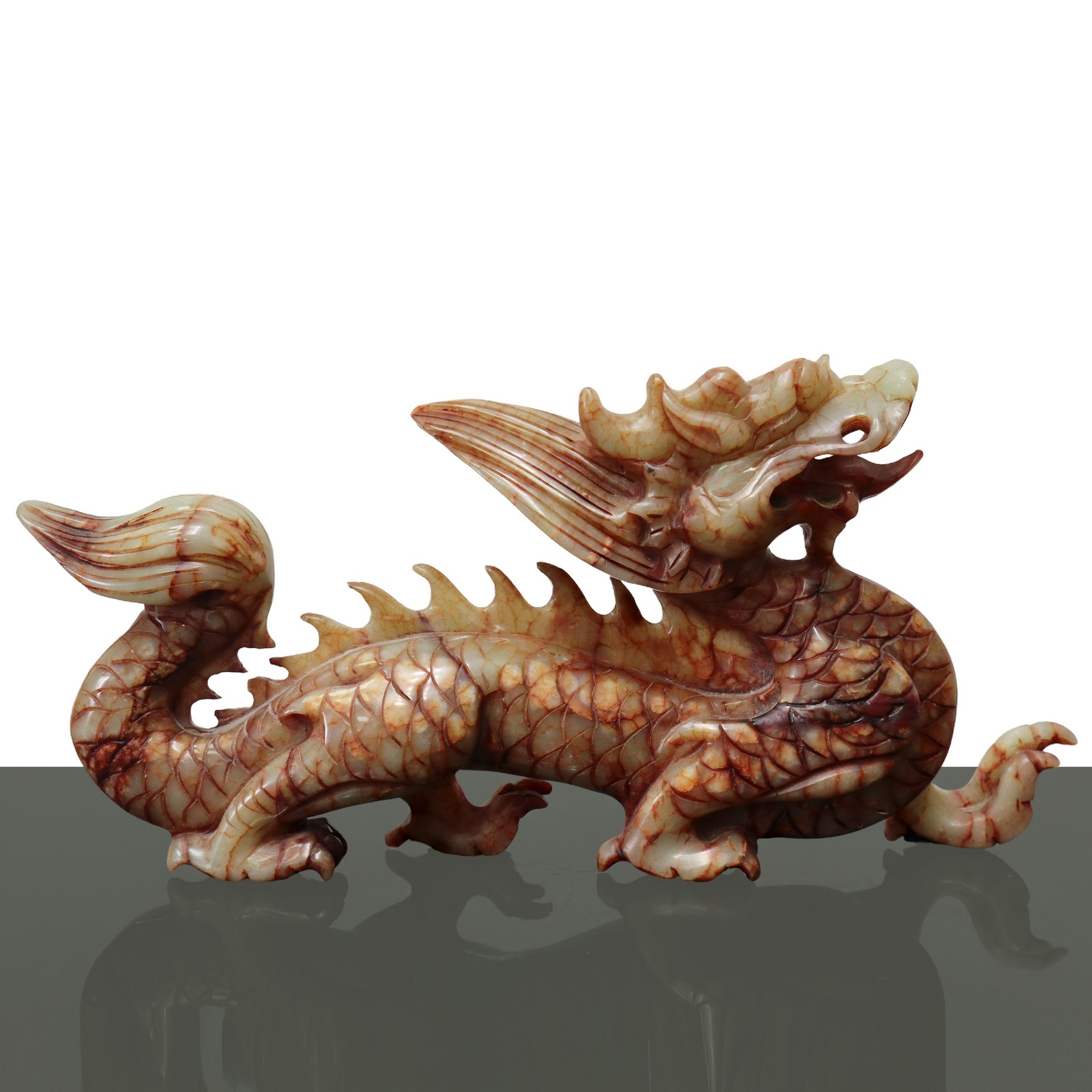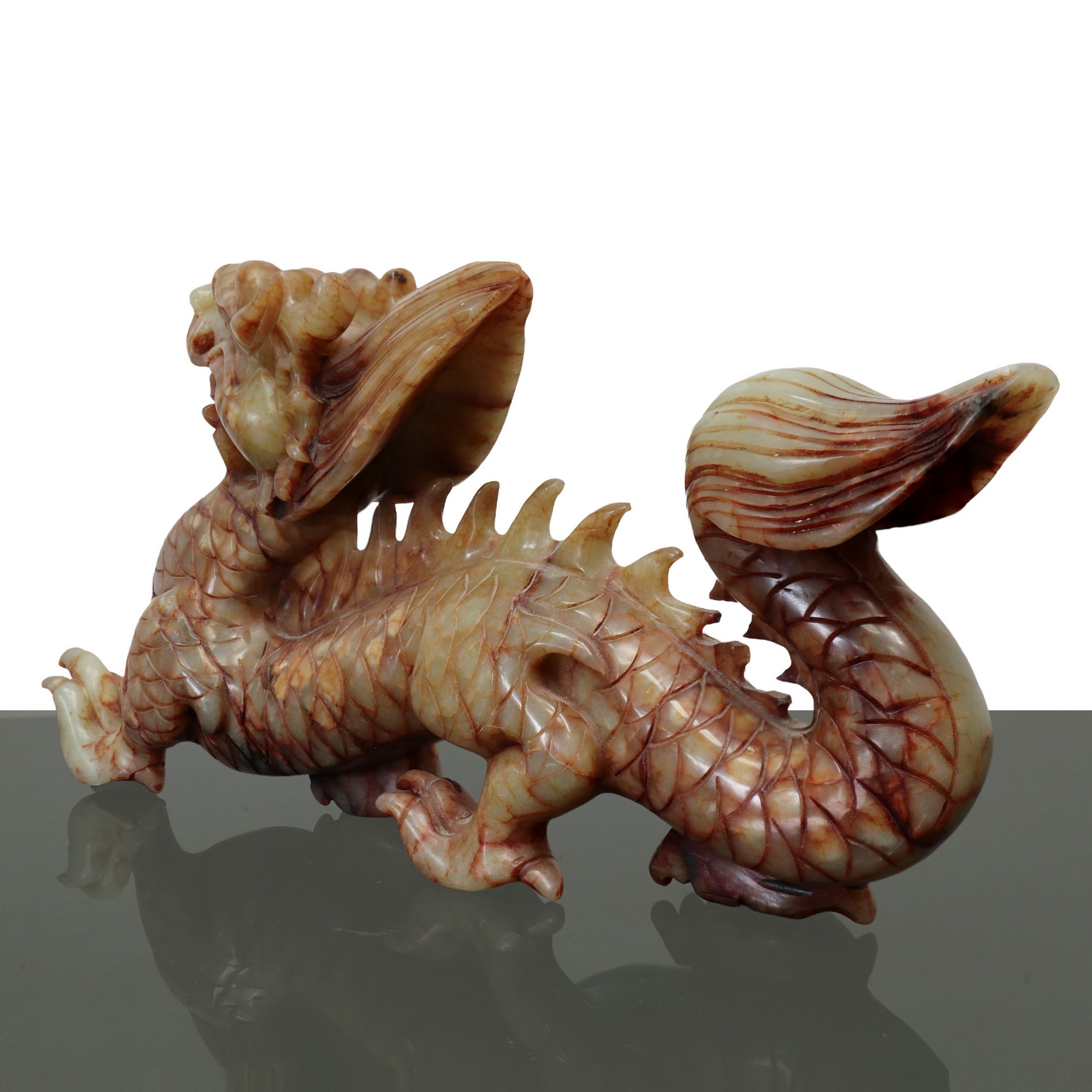 Drago cinese in pietra saponaria talisa H cm 15.5x34 Scultura di drago cinese realizzato in pietra saponaria talisa con squame e dettagli incisi. Un artiglio della zampa anteriore sinistra leggermente sbeccato.Scultura di drago cinese realizzato in pietra saponaria talisa con squame e dettagli incisi. Un artiglio della zampa anteriore sinistra leggermente sbeccato.