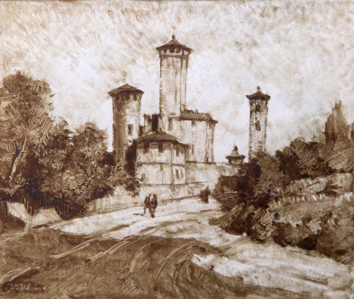 MUSSO CARLO Balangero (TO) 1907 - 1968 "Castello" 25x30 tecnica mista su...