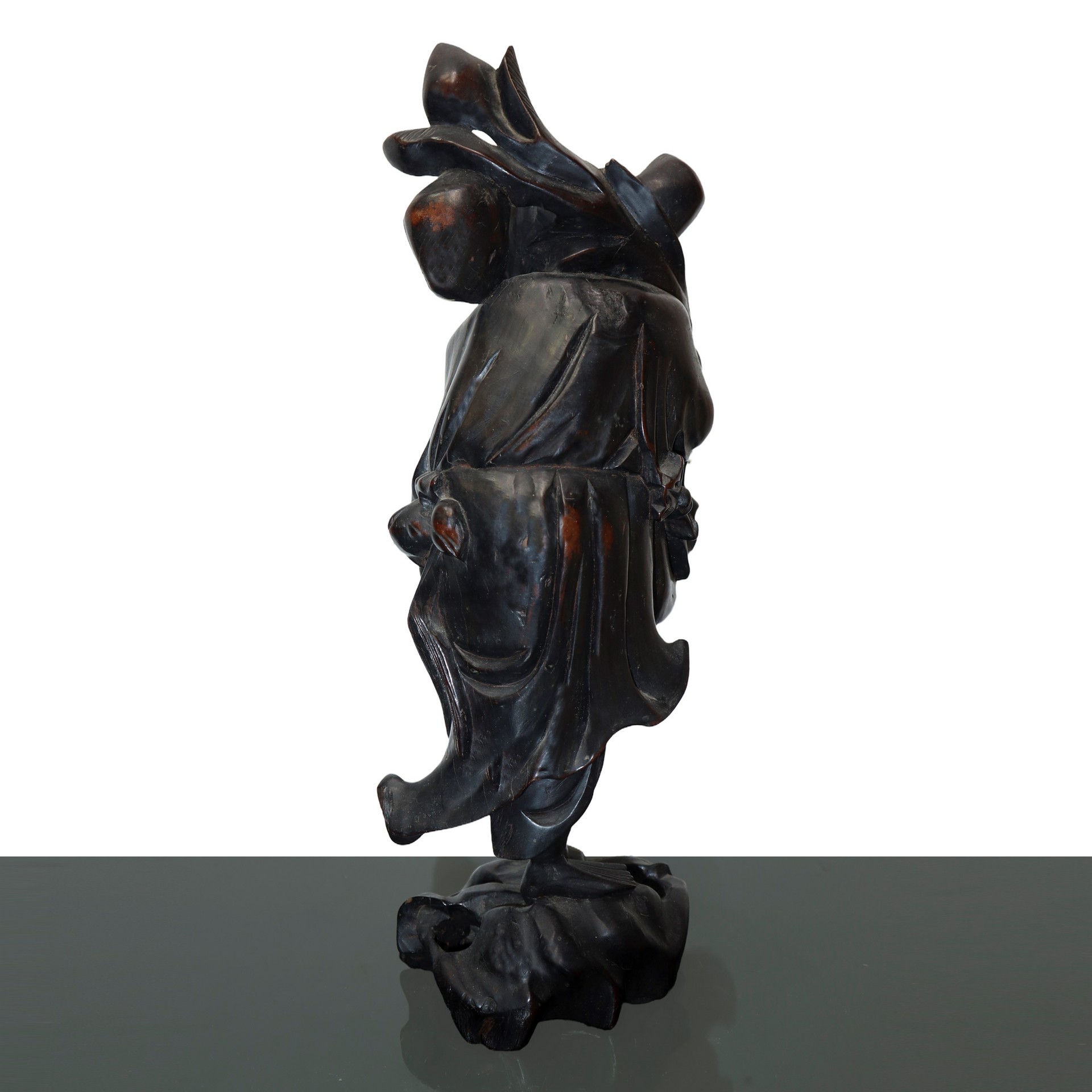 Coppia di statuine in legno intagliato del dio Shoulao H cm 40.5x14.5 Coppia di statuine lignee del dio taoista Shoulao. Denti e occhi in bianco. Le sculture raffigurano il dio come un uomo anziano dalla lunga barba, la testa allungata, abiti e acconciature orientali. La prima scultura rappresenta il dio che regge con la mano sinistra un pesce e con la mano destra un bastone con un cesto. Lo chignon è leggermente sclafito. La seconda scultura raffigura il dio con un ramo fiorito. La seconda scultura è mancate di un occhio bianco.Coppia di statuine lignee del dio taoista Shoulao. Denti e occhi in bianco. Le sculture raffigurano il dio come un uomo anziano dalla lunga barba, la testa allungata, abiti e acconciature orientali. La prima scultura rappresenta il dio che regge con la mano sinistra un pesce e con la mano destra un bastone con un cesto. Lo chignon è leggermente sclafito. La seconda scultura raffigura il dio con un ramo fiorito. La seconda scultura è mancate di un occhio bianco.