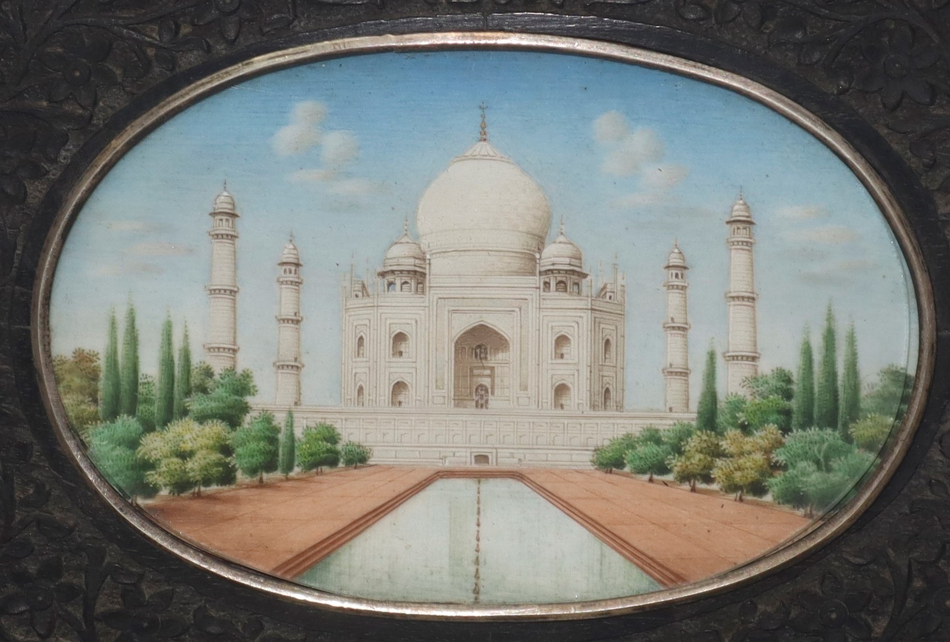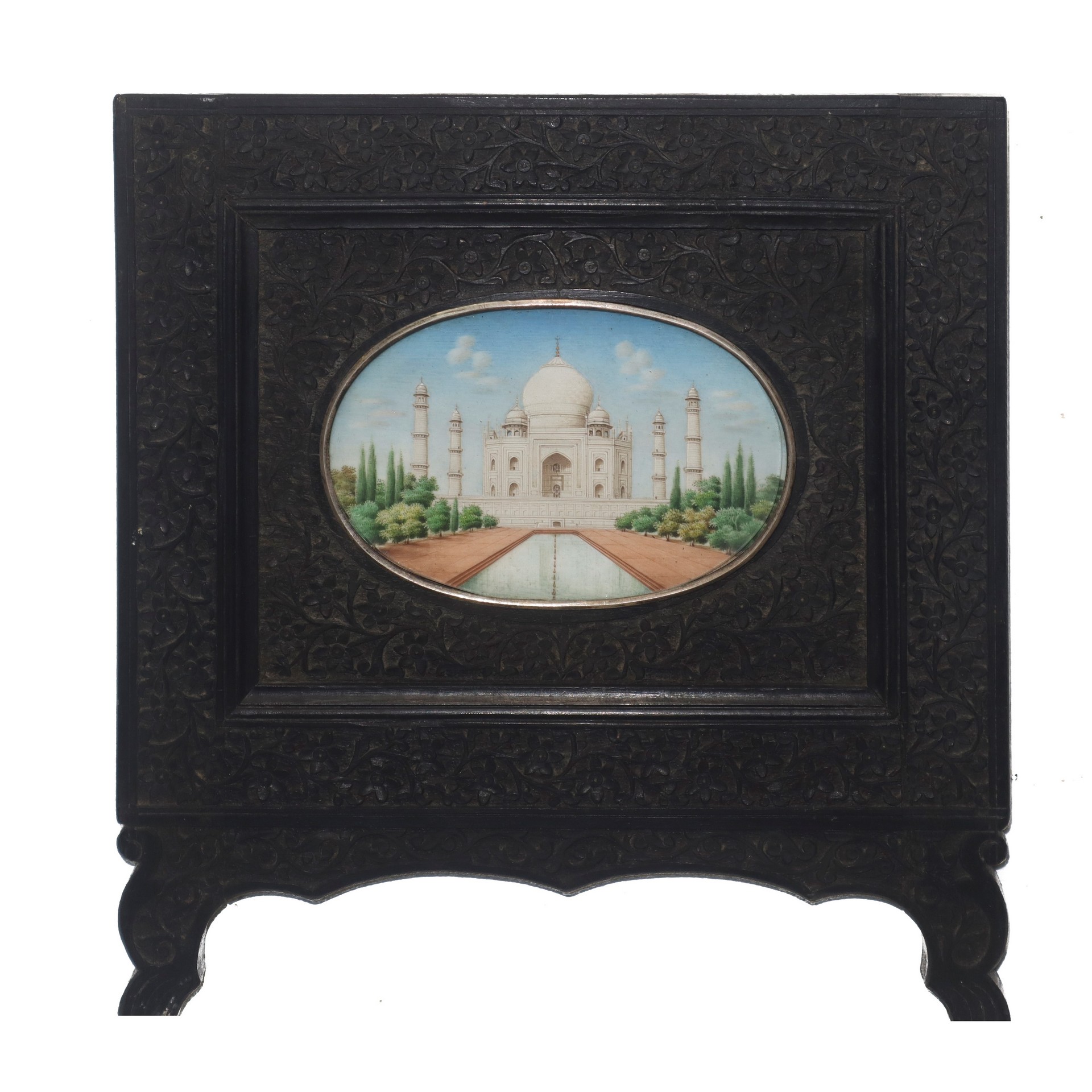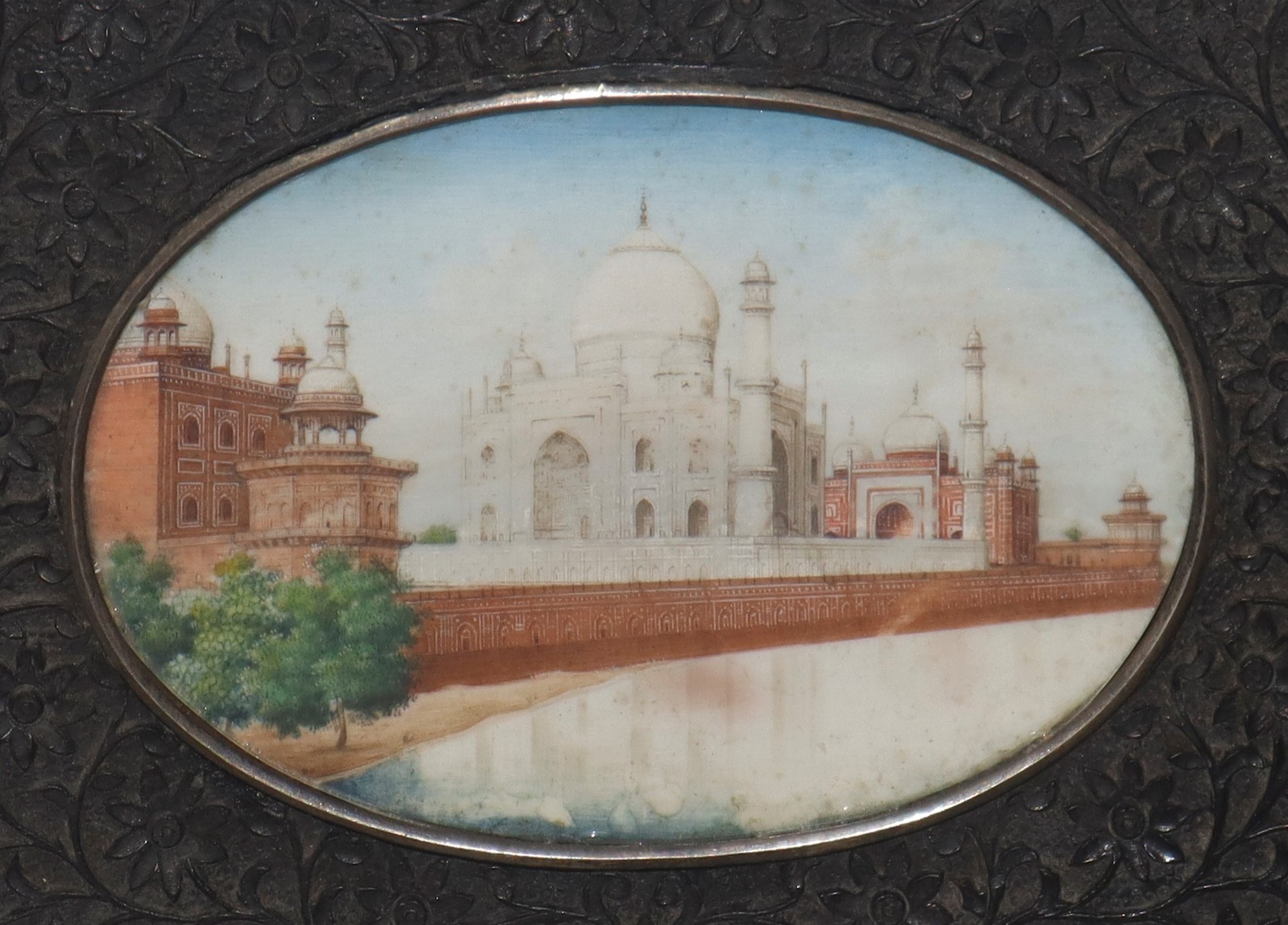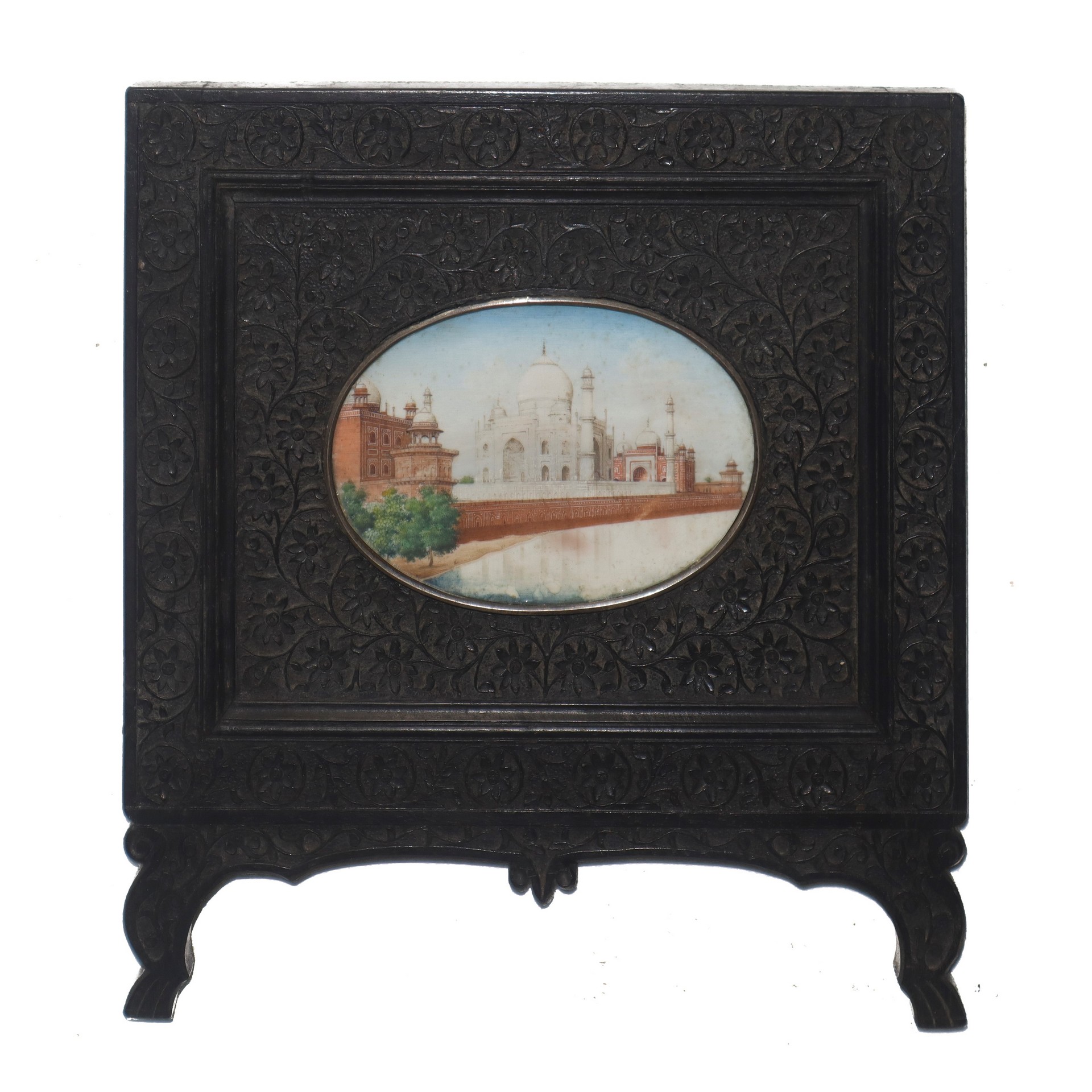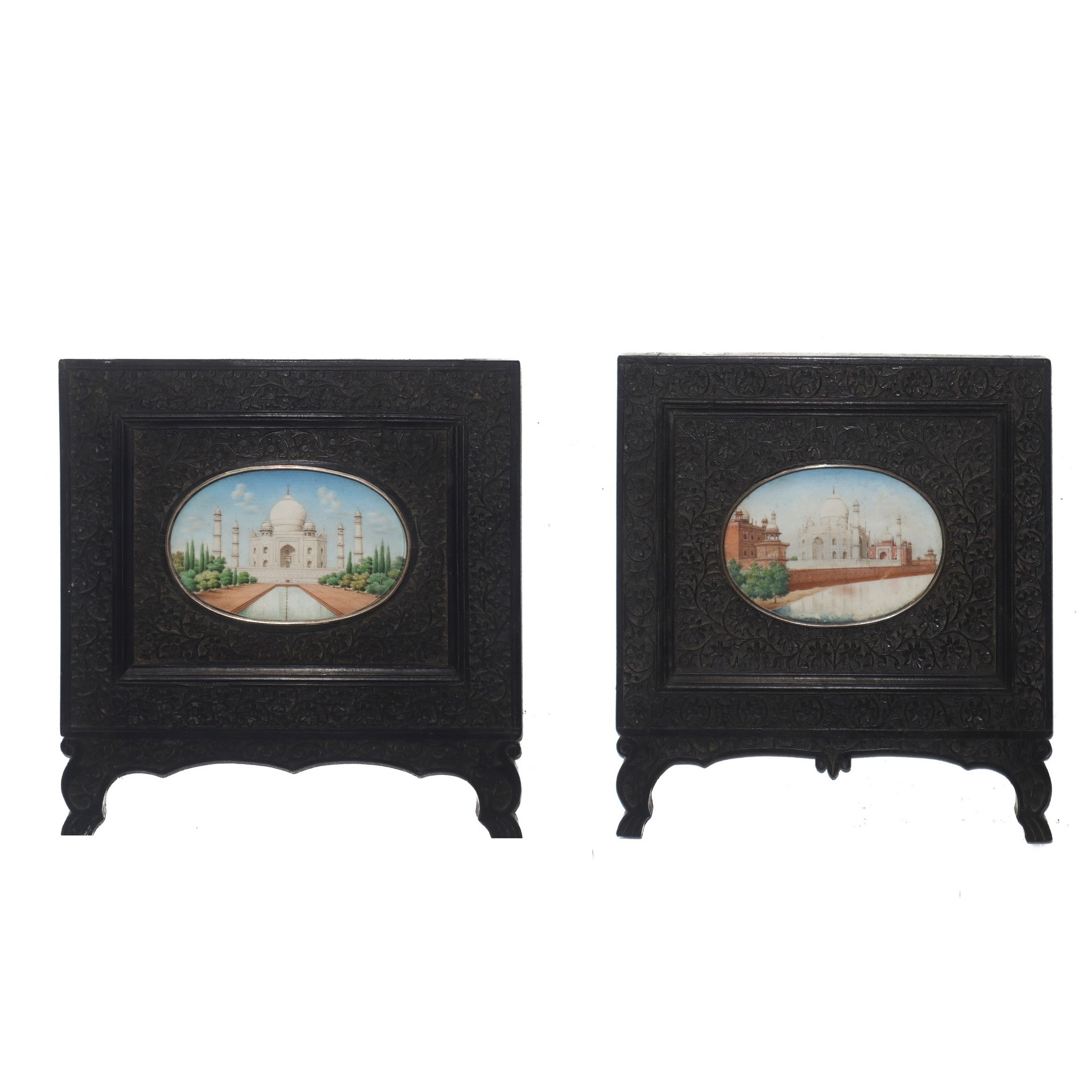 Coppia di ovali su avoriolina raffiguranti architetture indiane Cm 9 x 13 in cornice cm 26 x 25 In cornice di legno intagliato a motivi floreali.In cornice di legno intagliato a motivi floreali.