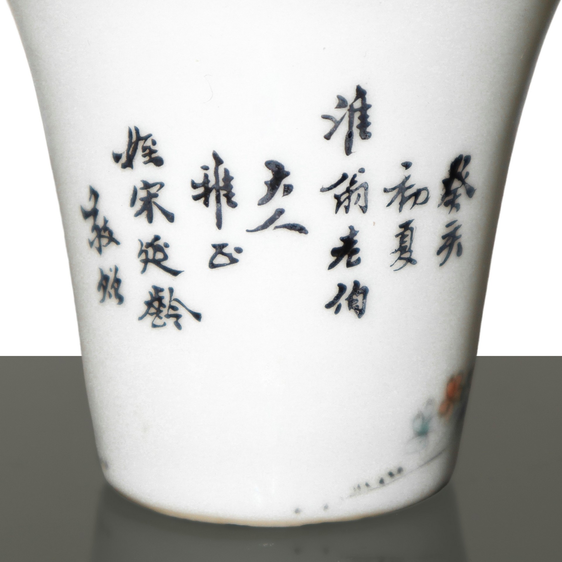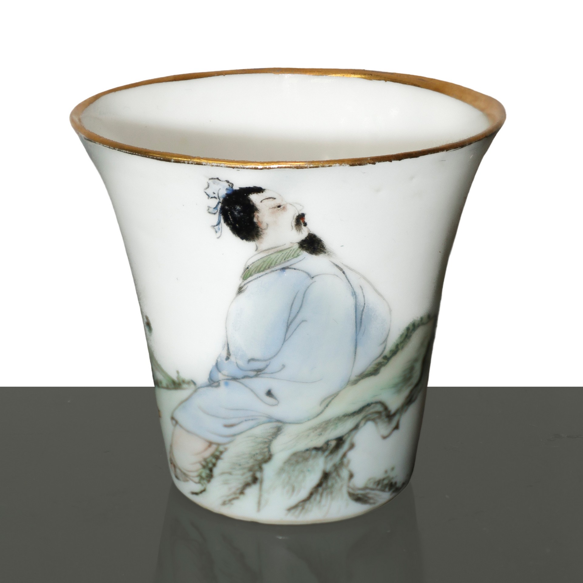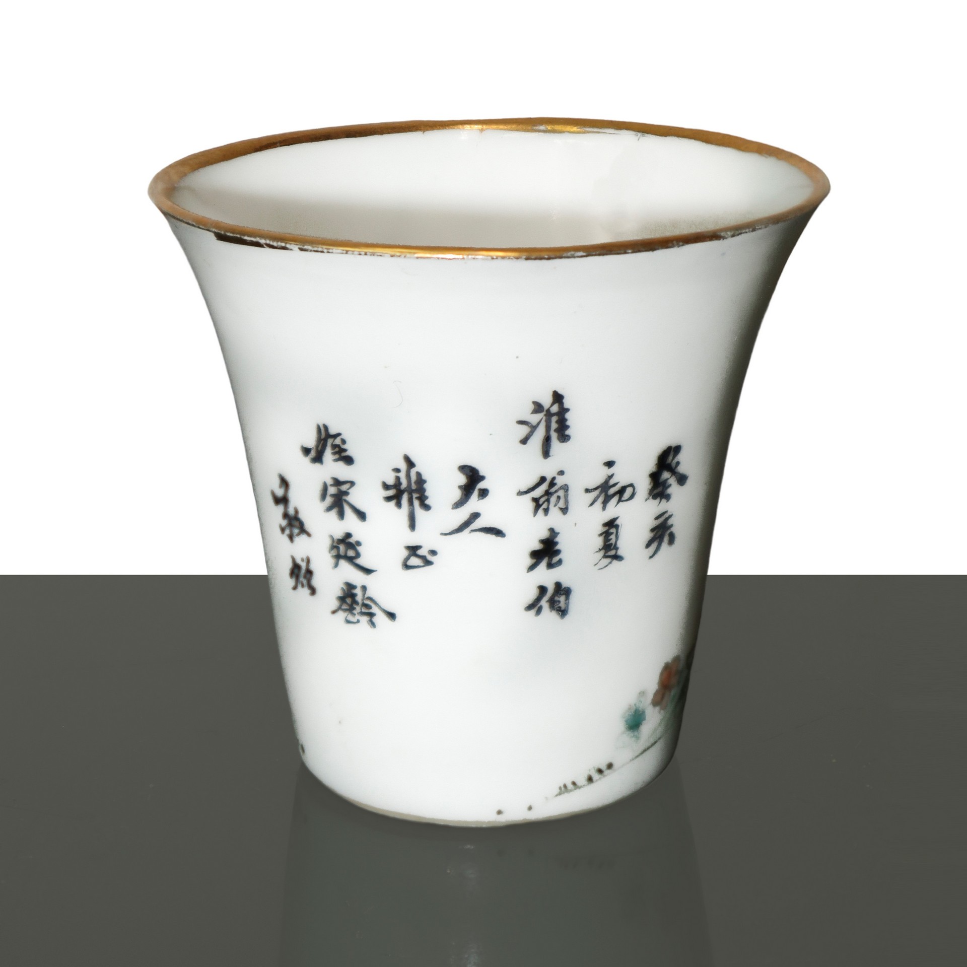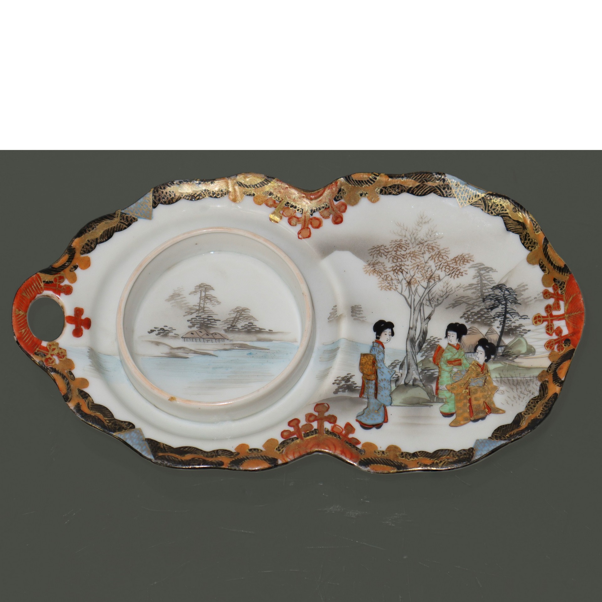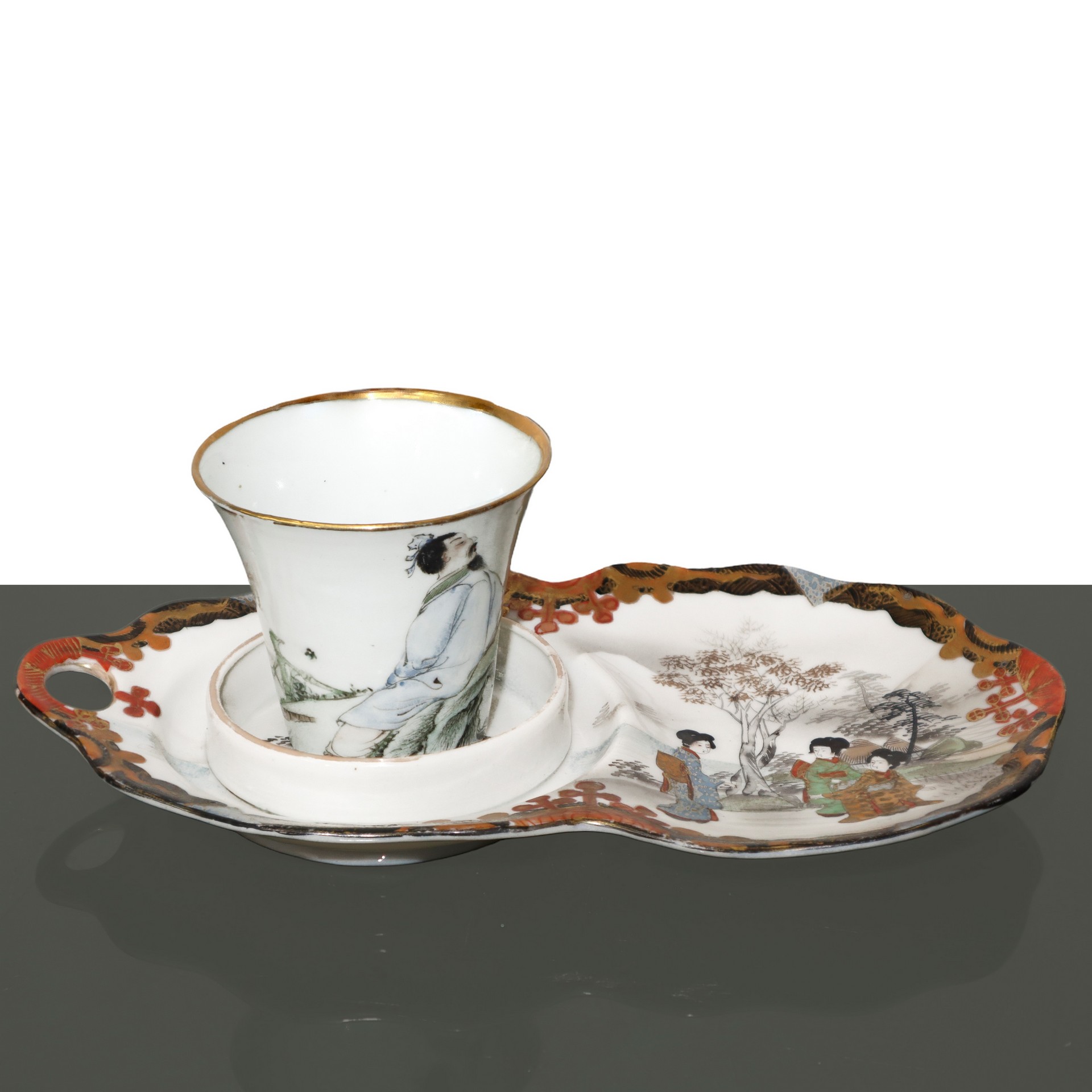 Antico vasetto orientali con vassoio dipinti a mano H cm 8x21 Vasetto in ceramica bianca con bordo dorato e iscrizioni cinesi, decorato con la figura di un uomo. Il vassoio ha il bordo decorato e scene di paesaggio con donne. Timbri con caratteri orientali alla base.Vasetto in ceramica bianca con bordo dorato e iscrizioni cinesi, decorato con la figura di un uomo. Il vassoio ha il bordo decorato e scene di paesaggio con donne. Timbri con caratteri orientali alla base.