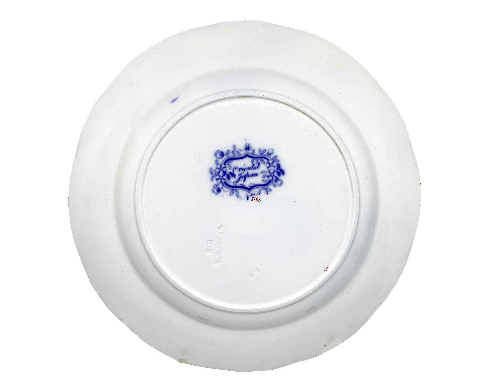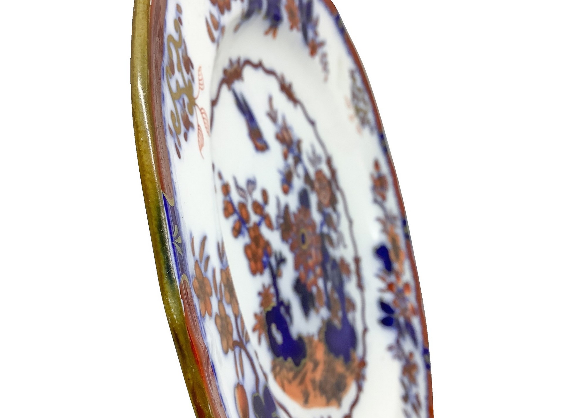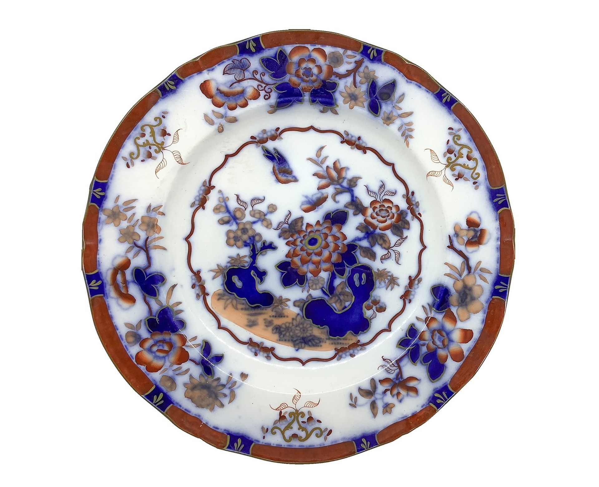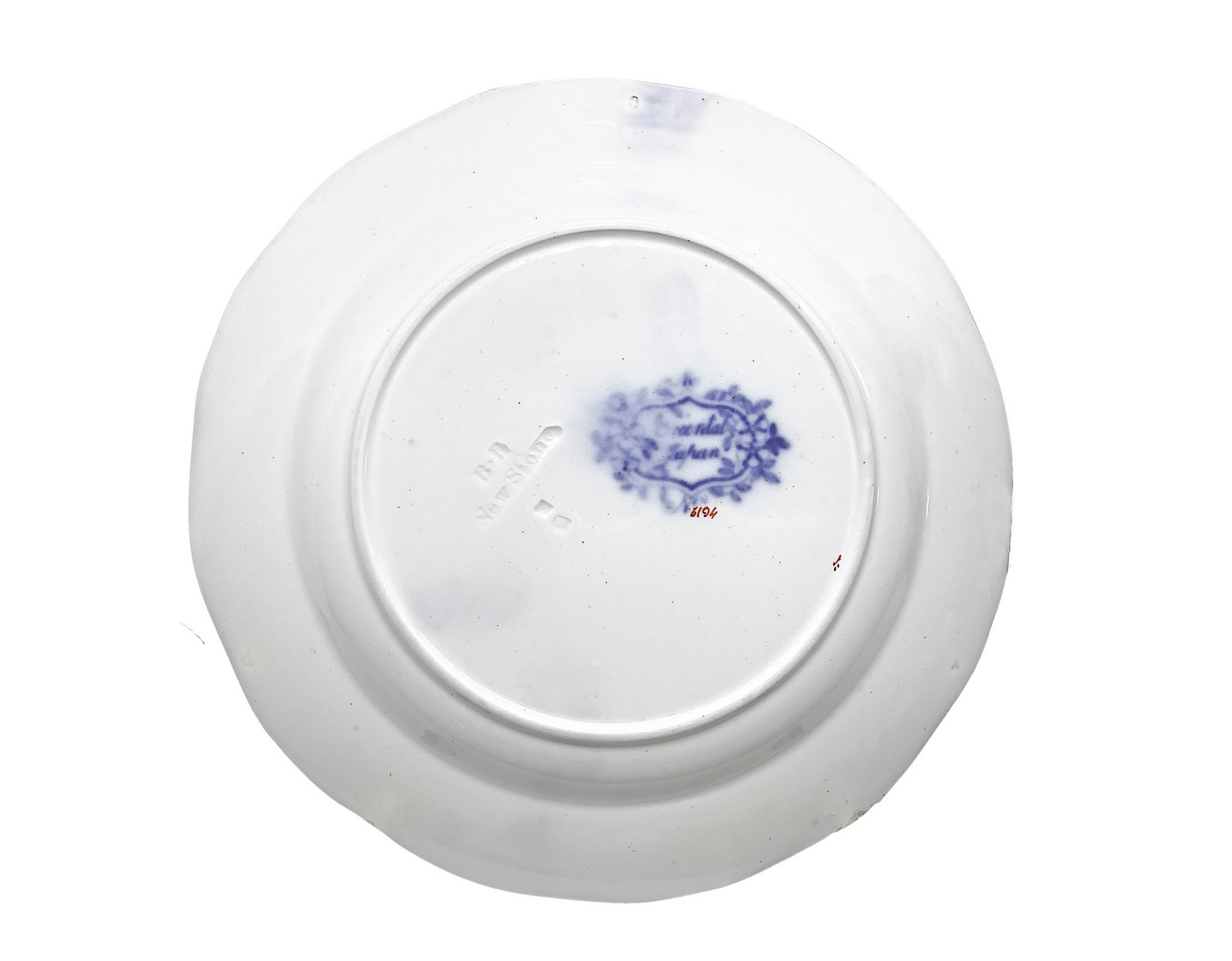 Tre piatti Oriental Japan con decorazioni floreali cinesi in blu e marrone su sfondo bianco, 20° secolo 2 D cm. 23 e 1 cm. 17 Porcellana policroma