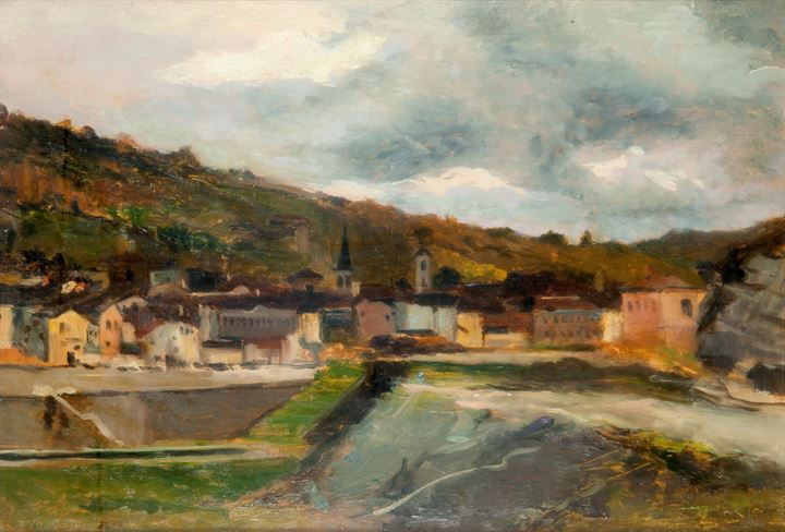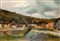 PITTORE DELLA SCUOLA DI DELLEANI "Profilo di città" 30x45 olio su tavoletta...