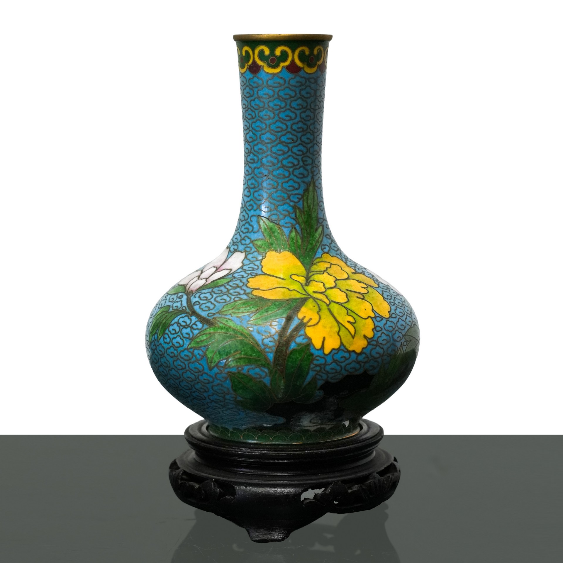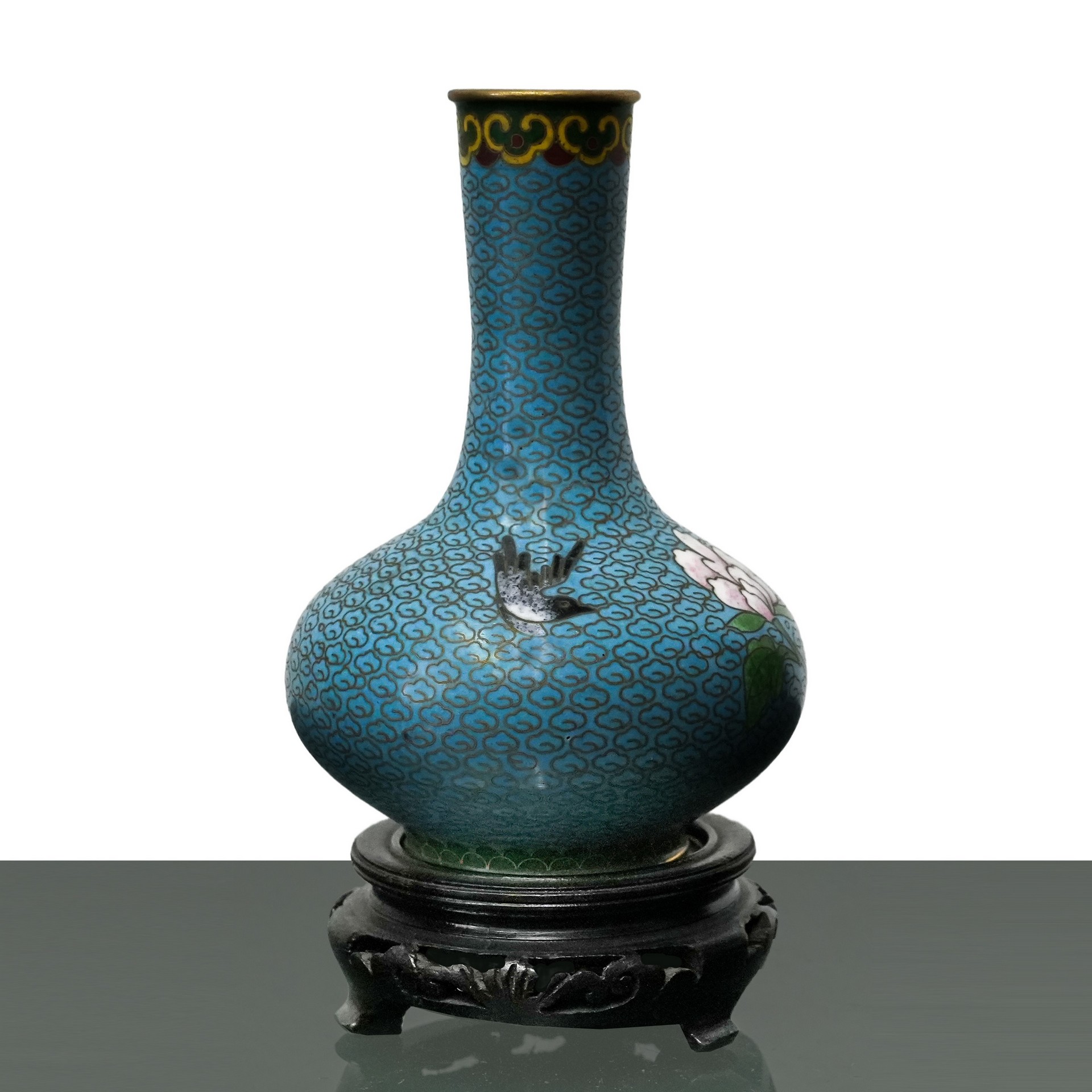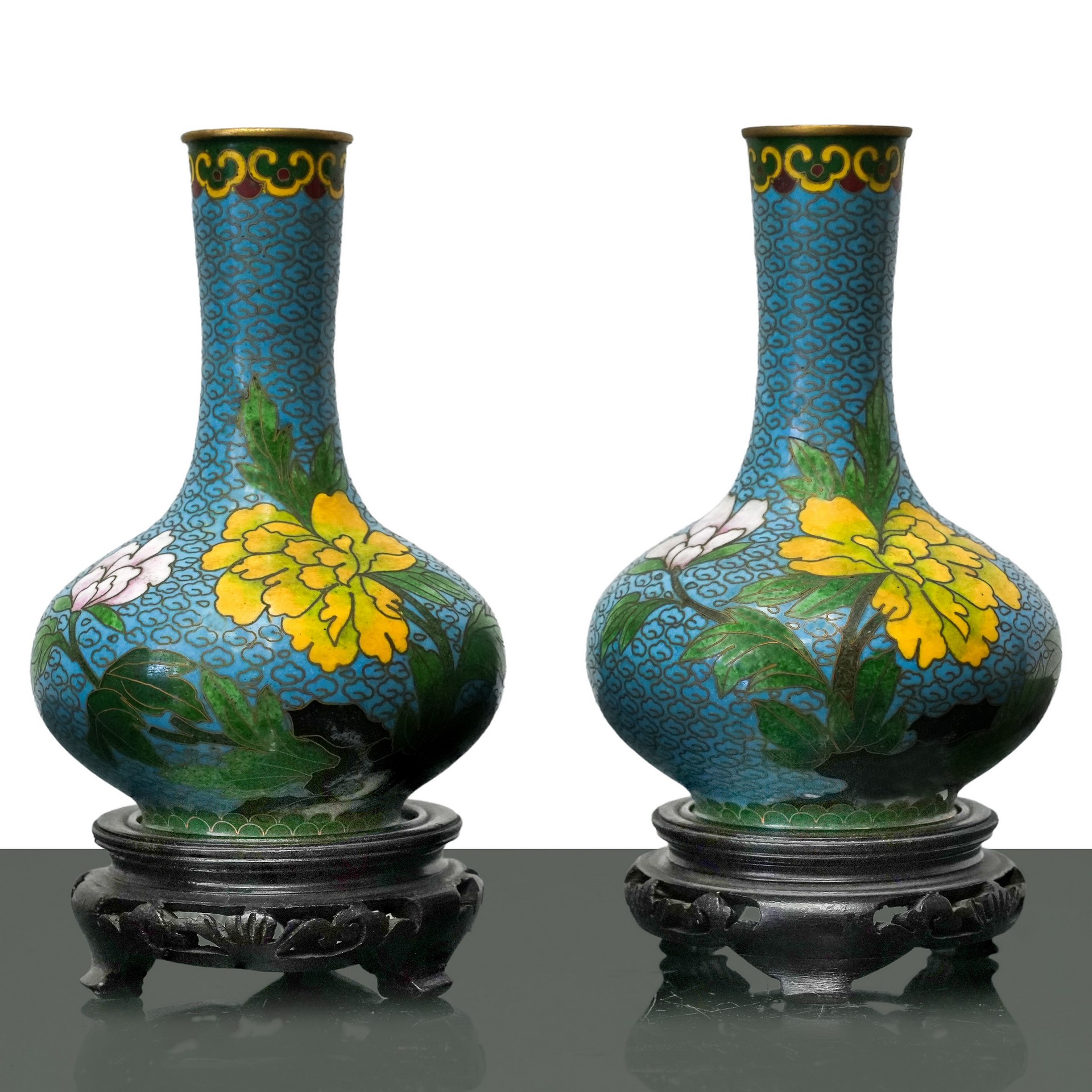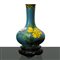 Coppia di vasi cloisonne sfondo azzurro con fiori di pesco e uccellino, decori in dorato H cm 13x8,5 Con basi in legnoCon basi in legno