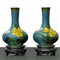 Coppia di vasi cloisonne sfondo azzurro con fiori di pesco e uccellino, decori in dorato