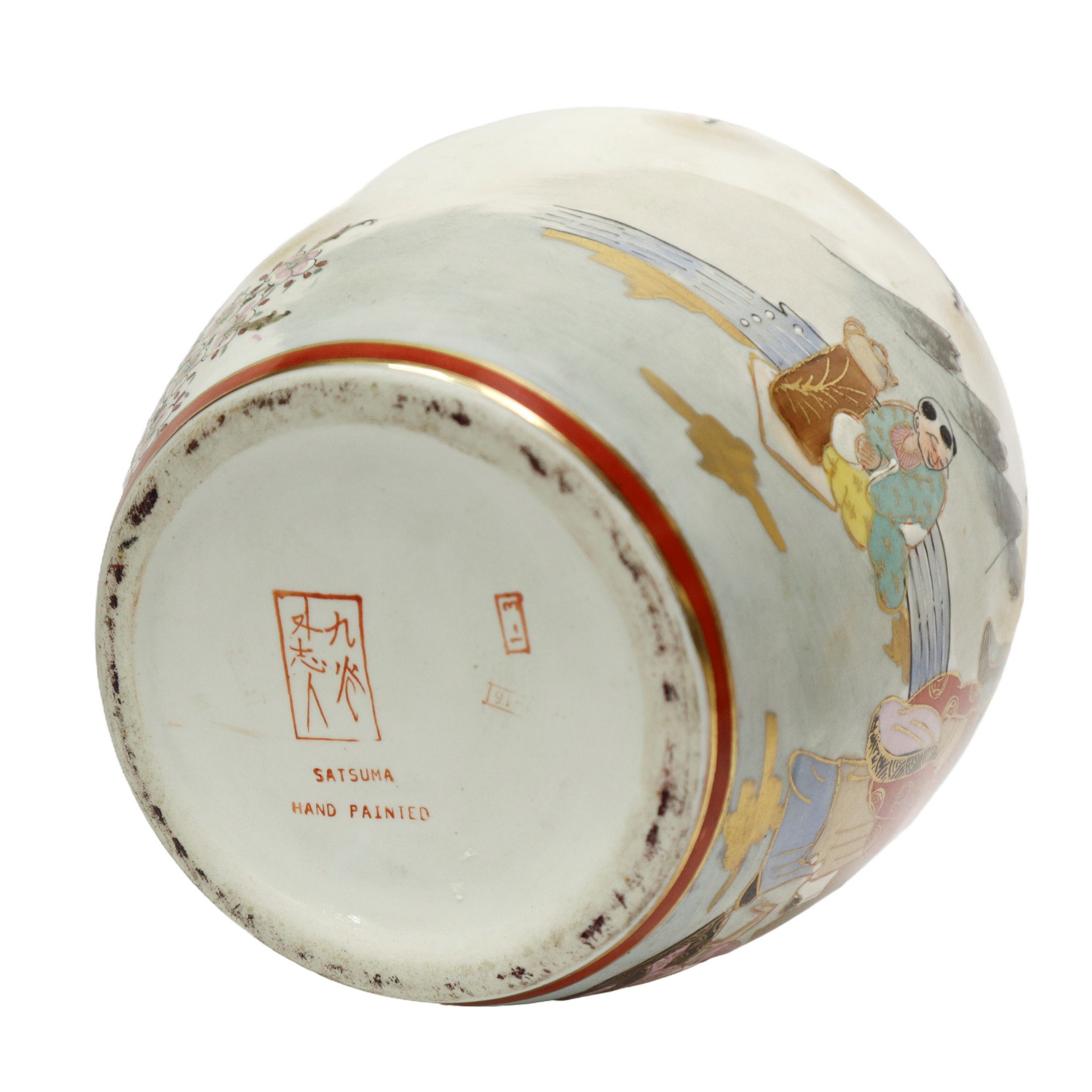 Vaso giapponese in porcellana Satsuma con coperchio e raffigurazione di saggi H cm 25,5x19 Dettagli in dorato. Marchio alla baseDettagli in dorato. Marchio alla base