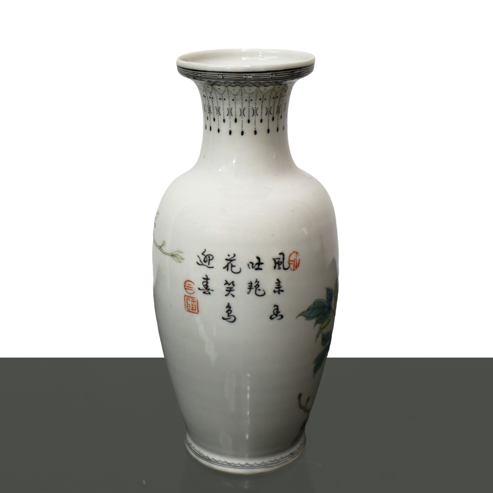 Vaso cinese di porcellana bianca con decoro floreale H cm 20.8x9 - con base H cm 23.9 Vase in porcellana bianca con decorazioni floreali policrome, uccello e iscrizioni con caratteri cinesi. Marchio con caratteri cinesi in rosso alla base. Base reggivaso in legno intagliato. Alcune macchie gialle sulla superficie. Vase in porcellana bianca con decorazioni floreali policrome, uccello e iscrizioni con caratteri cinesi. Marchio con caratteri cinesi in rosso alla base. Base reggivaso in legno intagliato. Alcune macchie gialle sulla superficie.