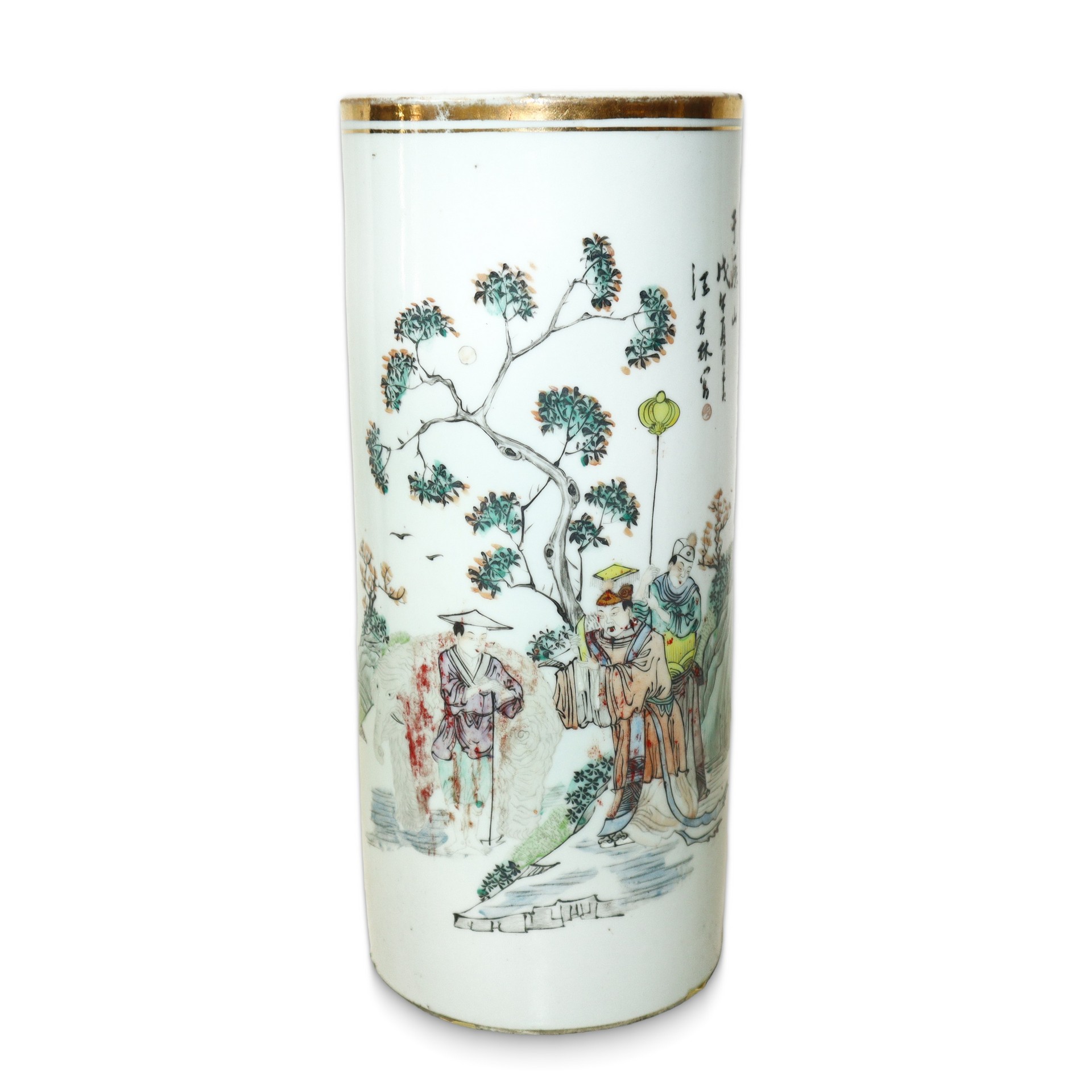 Vaso cinese a rollo cilindrico in porcellana famiglia rosa dinastia Quinq, nineteen° secolo H cm 18.5x12.4 Vaso cinese in porcellana famiglia rosa con raffigurazione di figure di uomini e albero. Iscrizioni con caratteri cinesi e decorazioni dorate. Timbro di cera lacca alla base. Documenti "Certificate of identity"  - Hong Kong Art Craft Group all'interno.Vaso cinese in porcellana famiglia rosa con raffigurazione di figure di uomini e albero. Iscrizioni con caratteri cinesi e decorazioni dorate. Timbro di cera lacca alla base. Documenti "Certificate of identity"  - Hong Kong Art Craft Group all'interno.