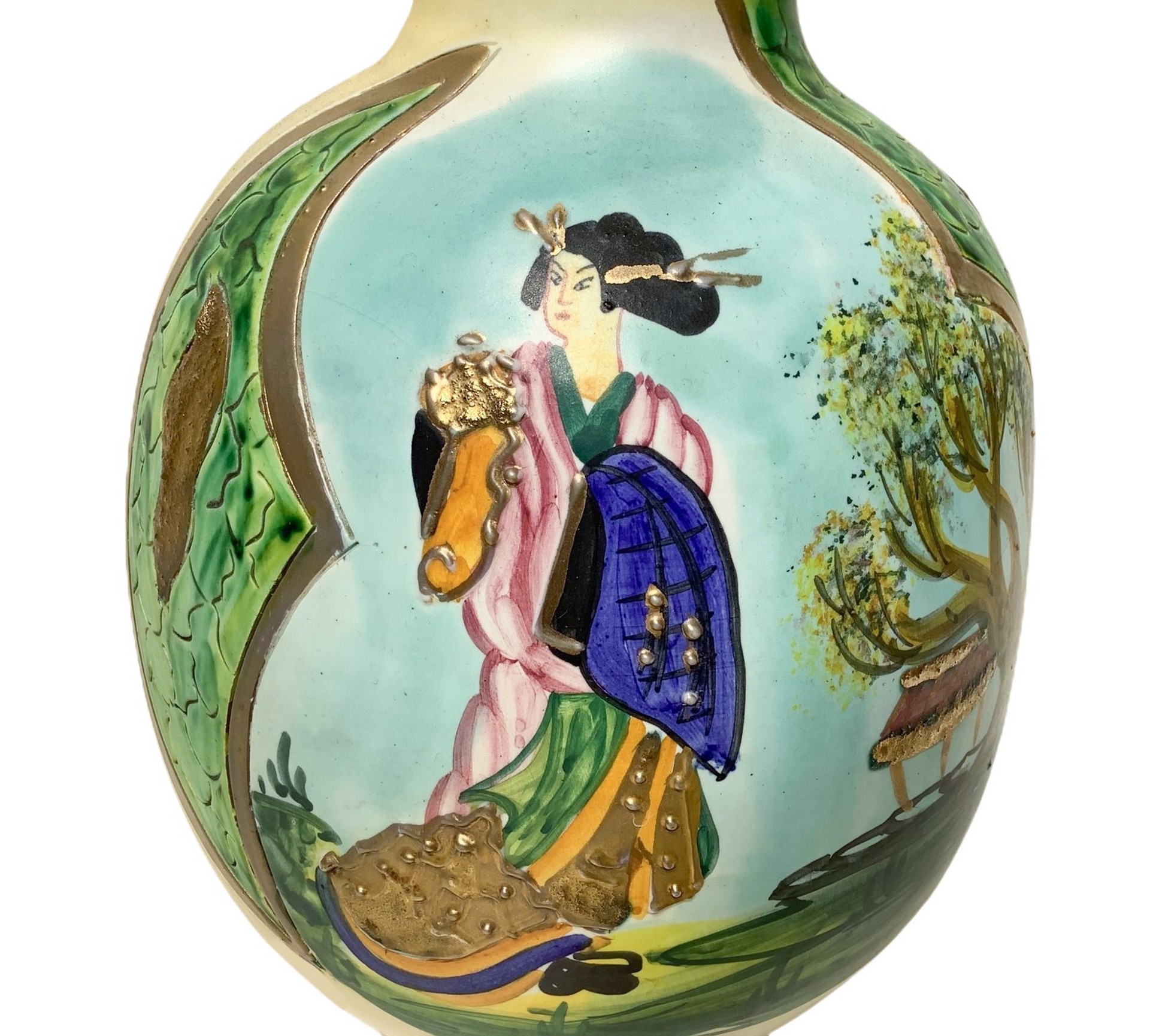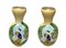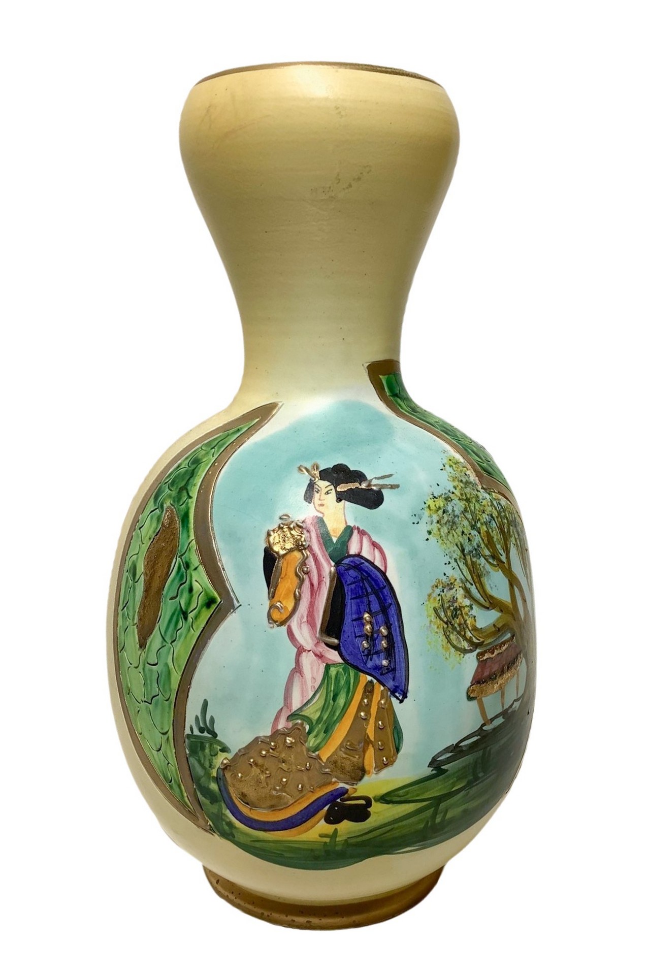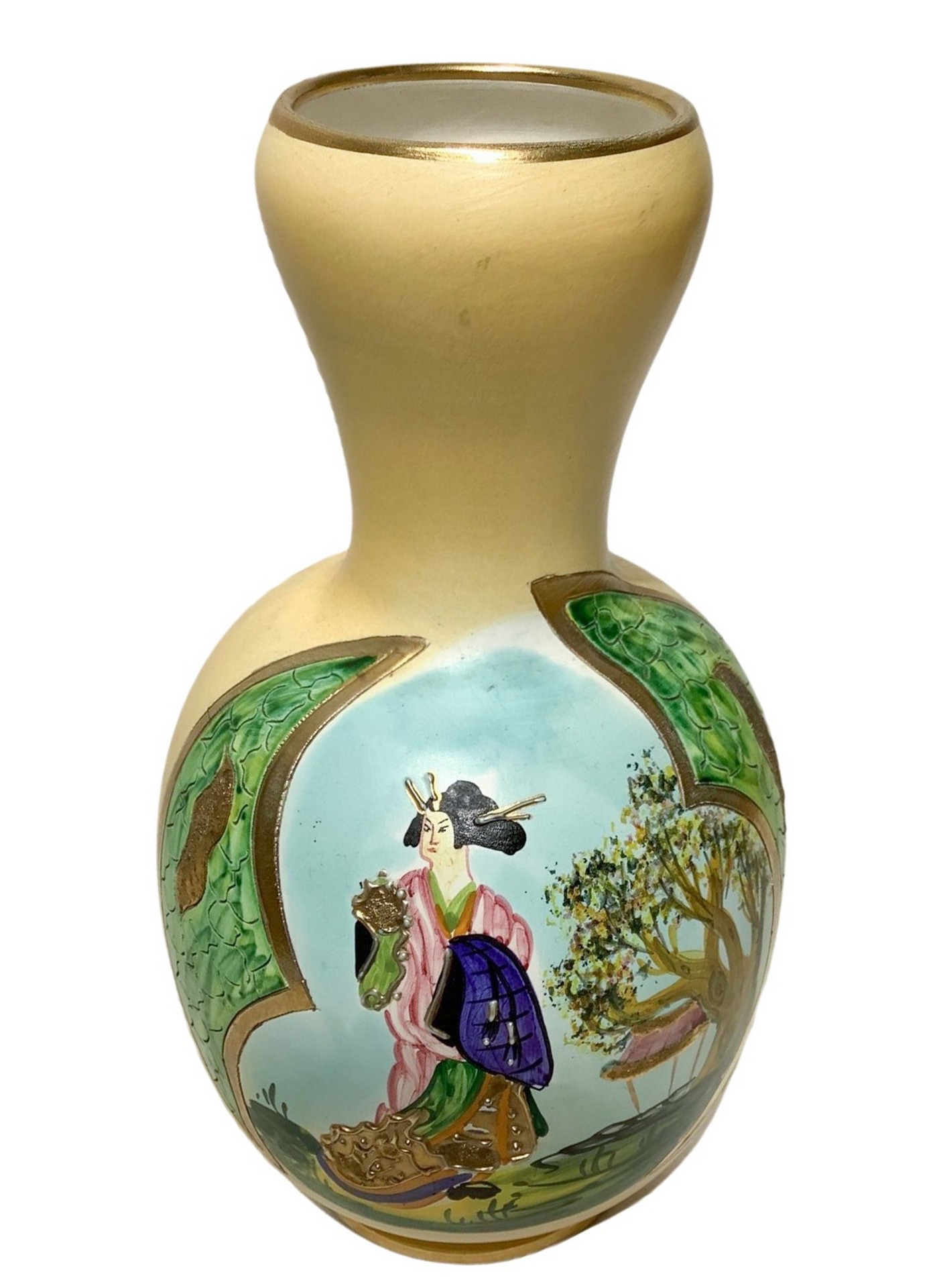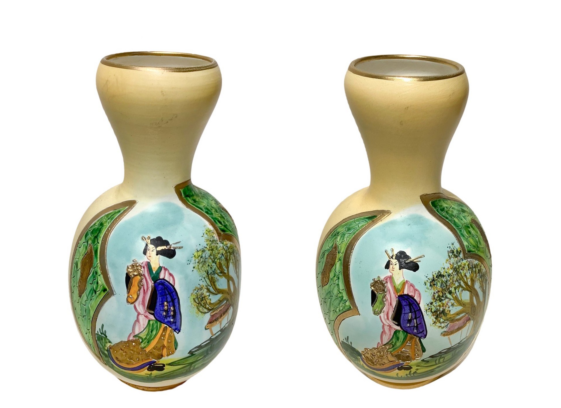 Coppia di vasi dipinti con scene di genere cinesi, inserti in oro su base beije. H cm 32
