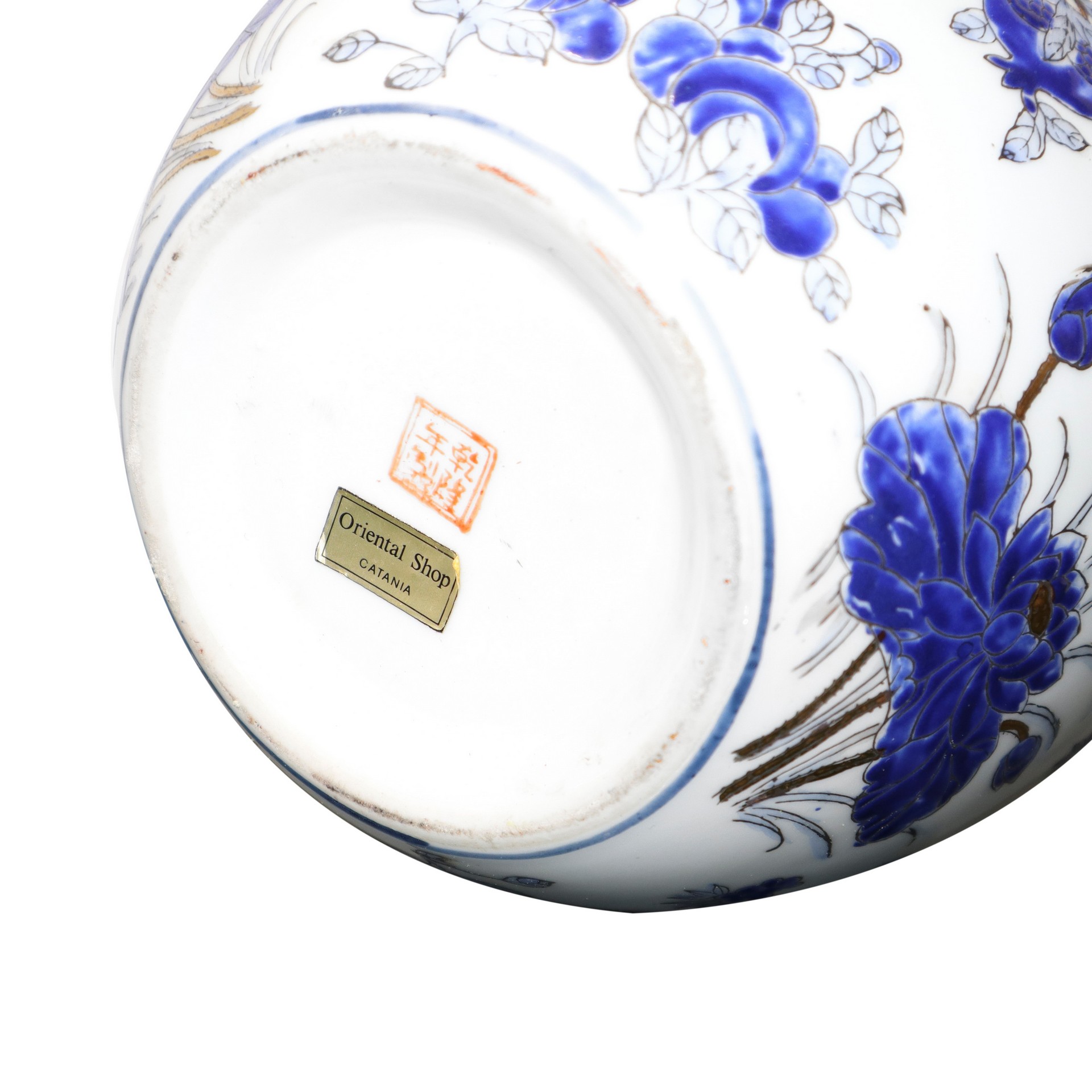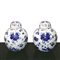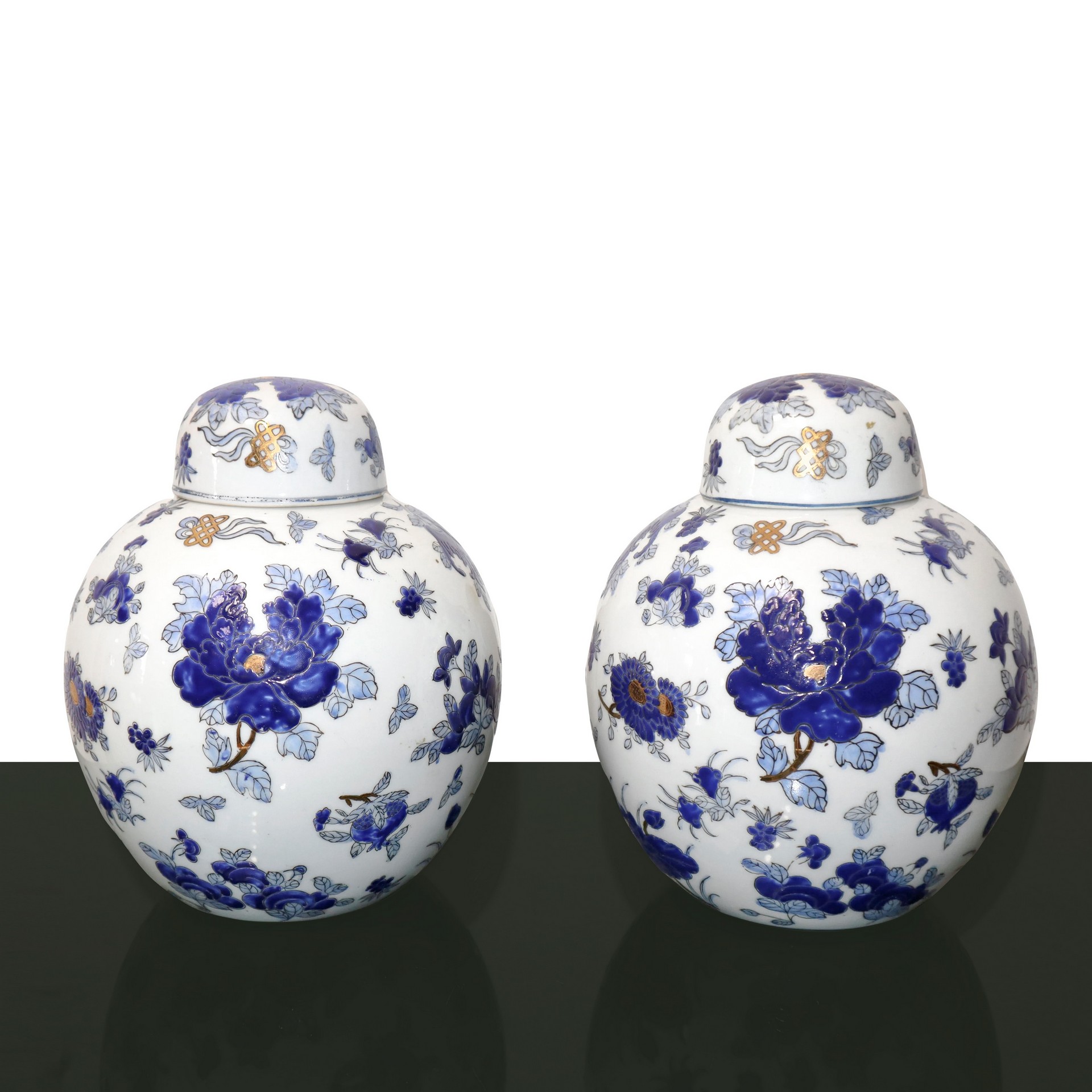 Coppia di poutiche cinesi H cm 22 , L cm 16 Su base bianca con decorazioni floreali nei toni del blu e dell'oro.Su base bianca con decorazioni floreali nei toni del blu e dell'oro.