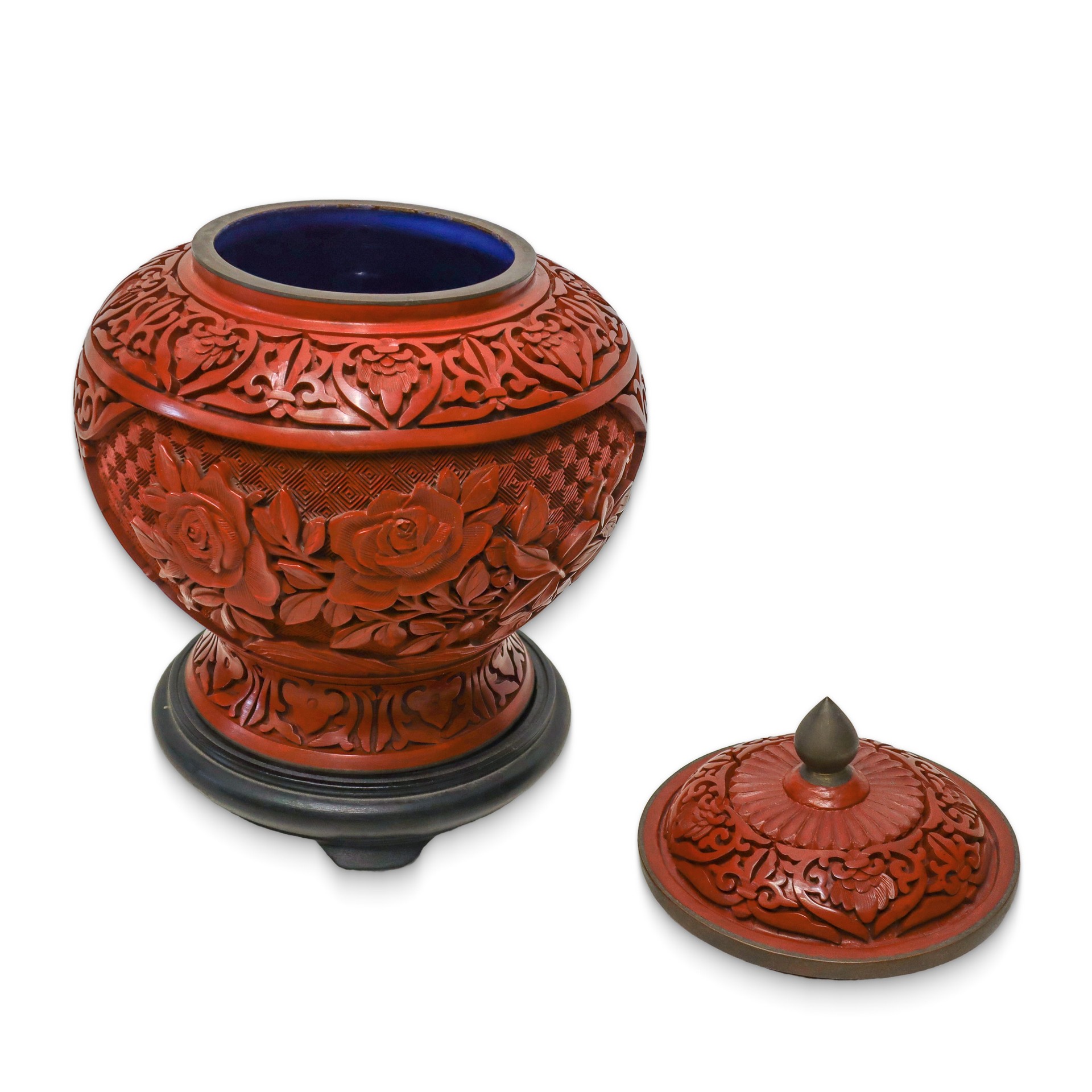 Vaso cinese porta zenzero intagliato in lacca rossa con coperchio H cm 19,5x14 Finiture in bronzo e interno e base smalto bluFiniture in bronzo e interno e base smalto blu