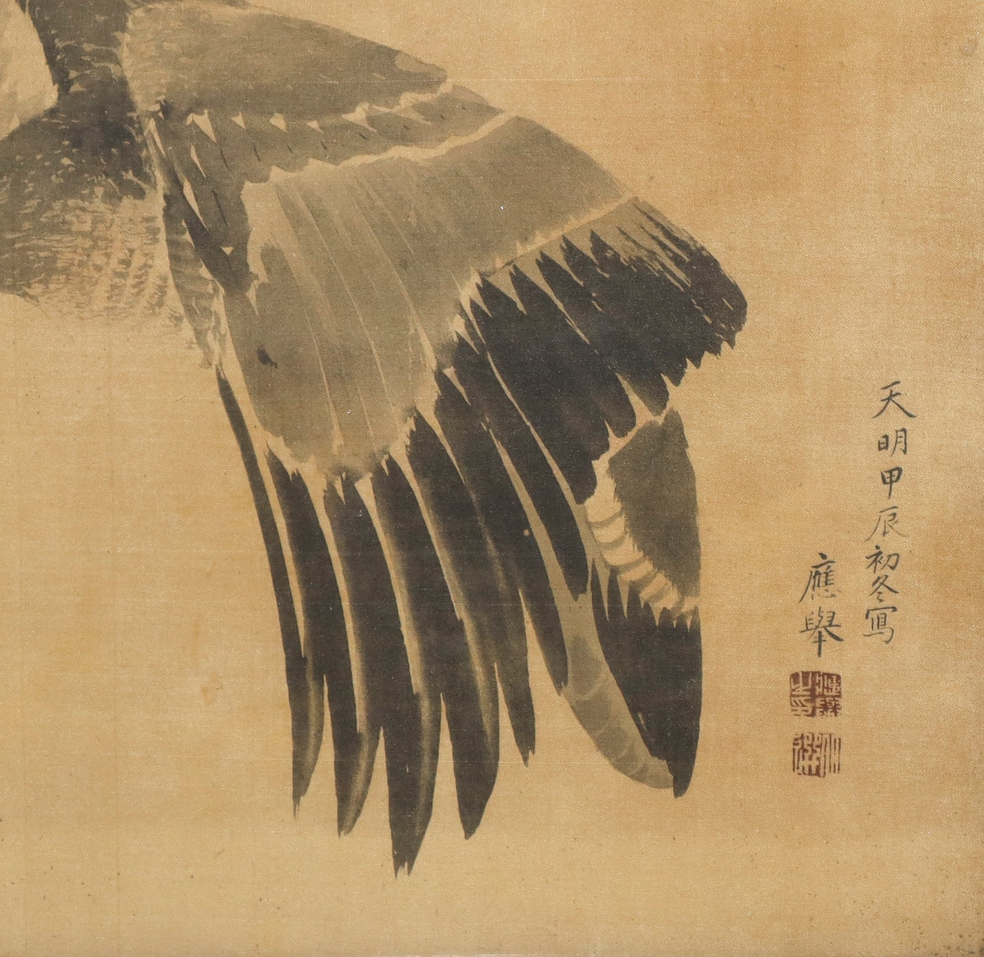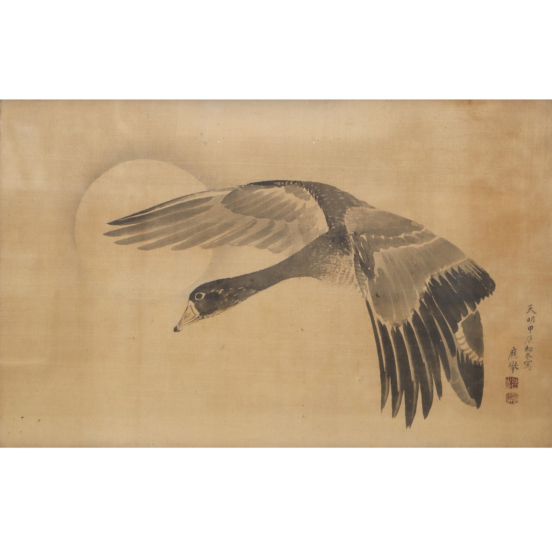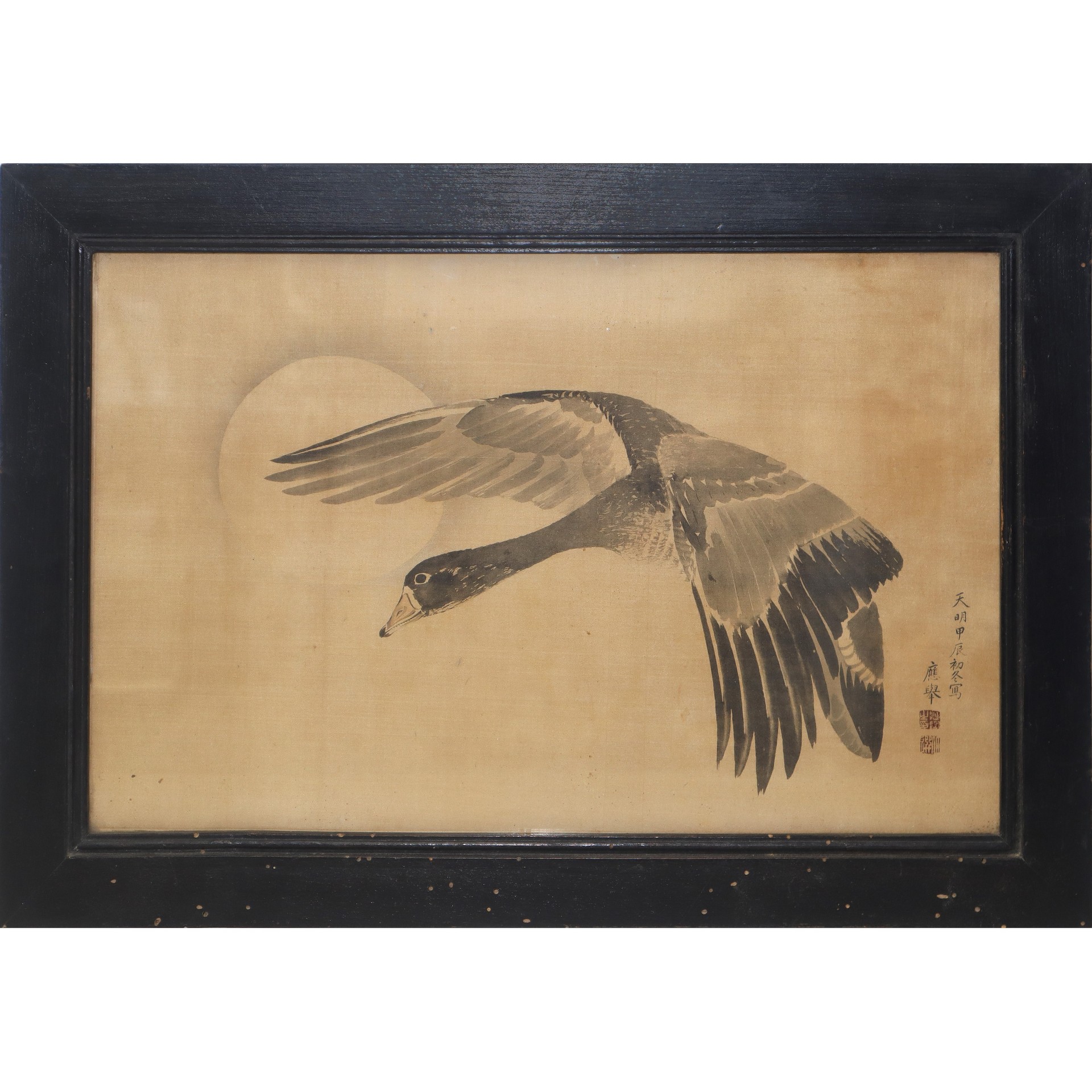 Anatra in volo Cm 26 x 39, in cornice di legno nero 32 x 46 Dipinto su seta