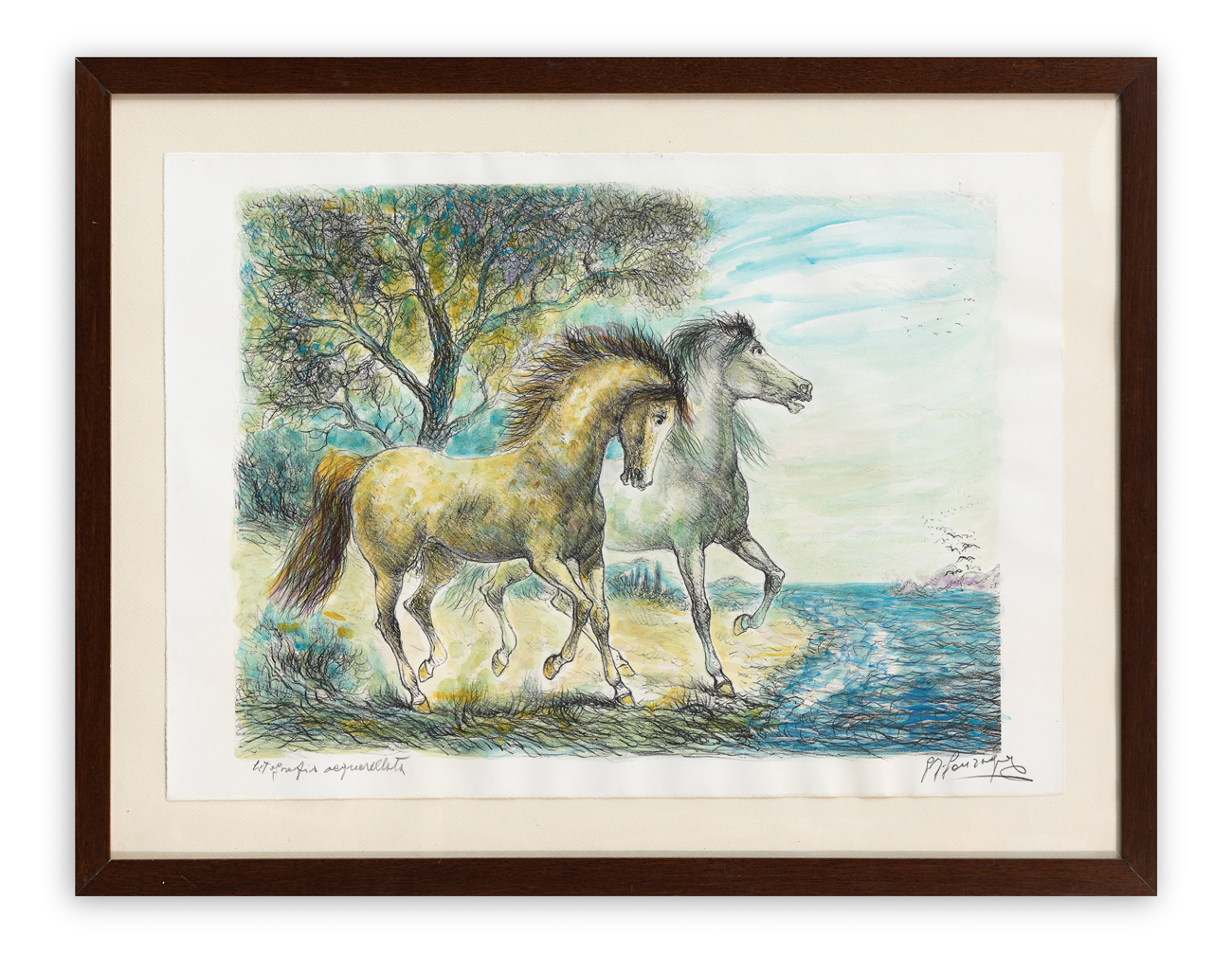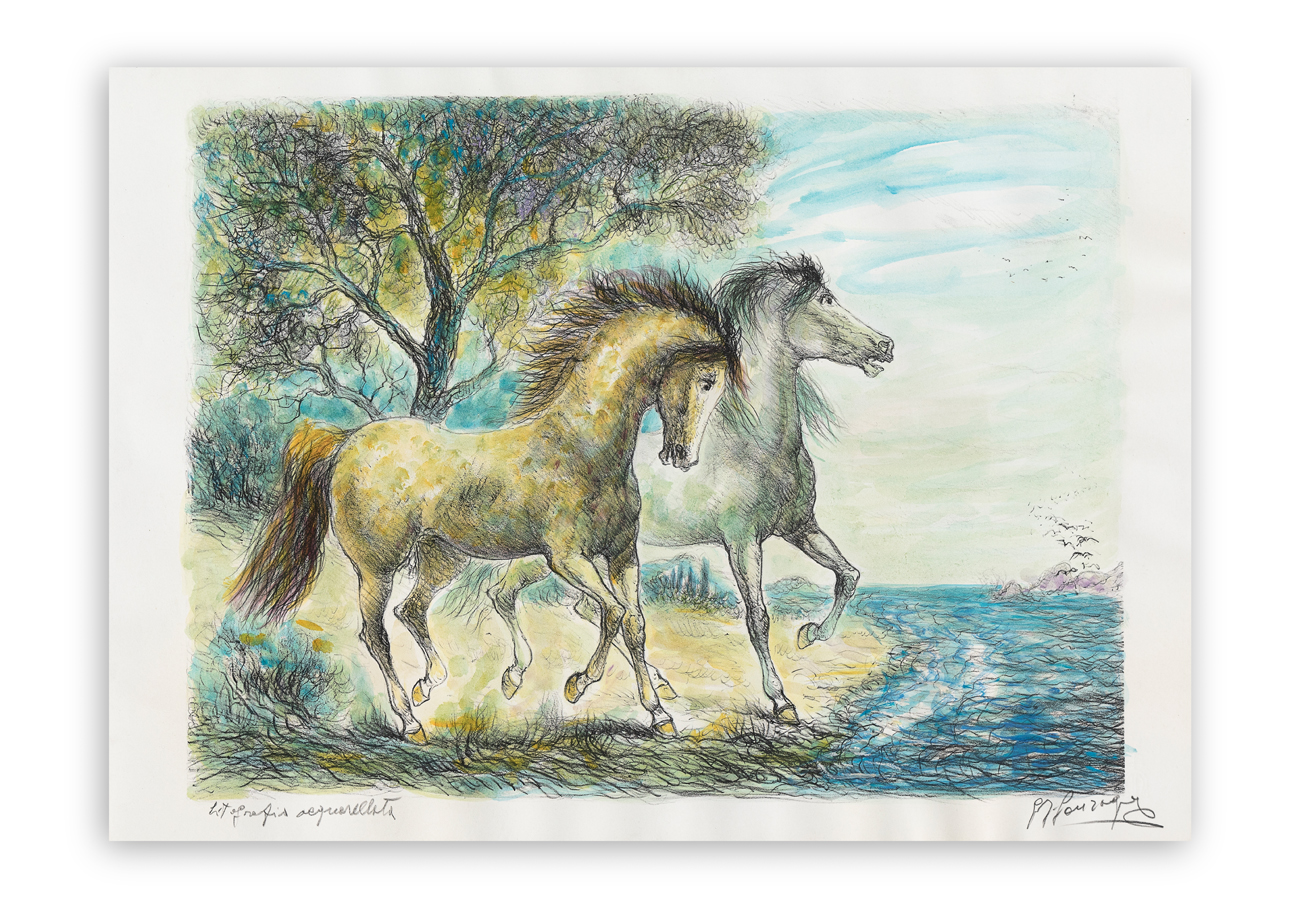 Firma e iscrizione 'Litografia acquerellata' a matita al fronte