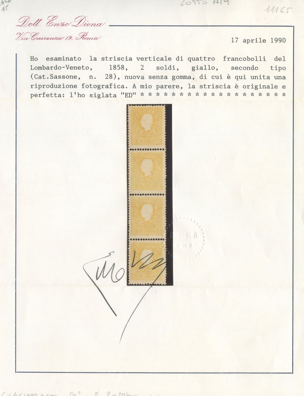 1859 - 2s. giallo n.28 in striscia verticale di 4 con gomma parziale e valutato come senza gomma. (A+) (Cert. Enzo Diena)
