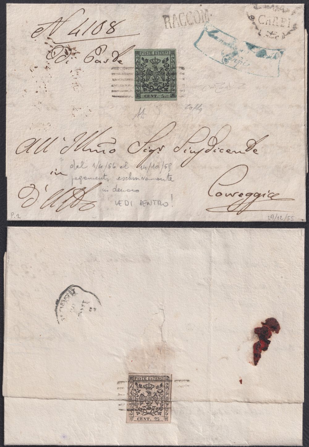 1858 - Lettera raccomandata da Carpi per Correggio affrancata tramite un 5 cent. verde oliva n.8 ed un 25 cent. camoscio chiaro n.4 al retro utilizzato come chiudilettera. (A-) (Alberto Diena, Raybaudi, Colla)