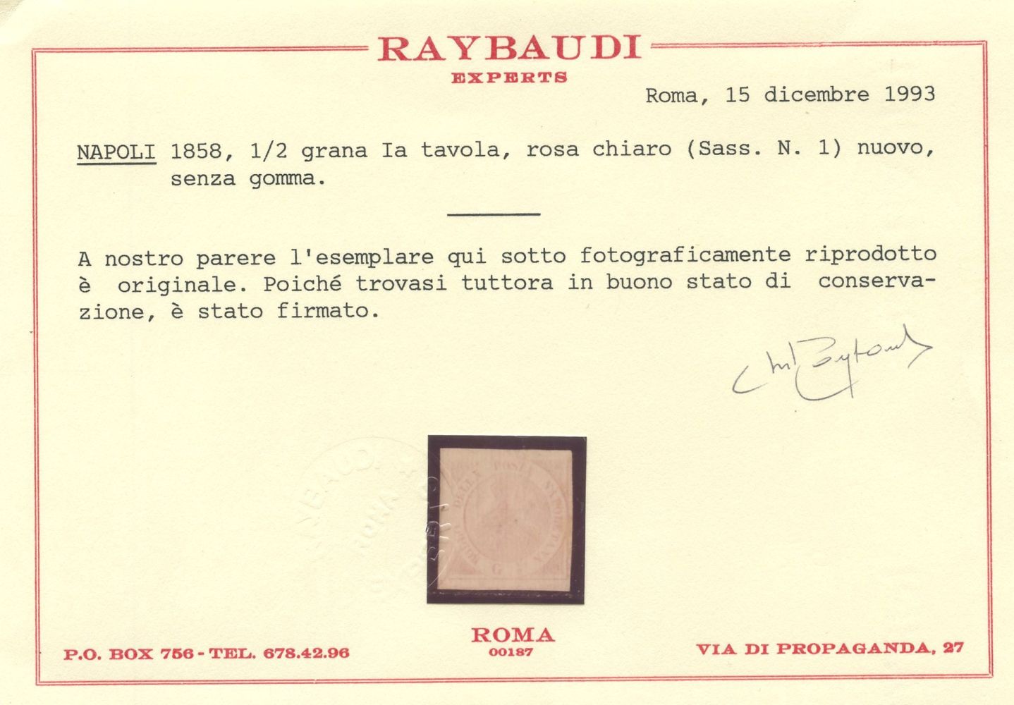 1858 - 1/2gr. rosa chiaro n.1 nuovo senza gomma. (A-) (Cert. Raybaudi)