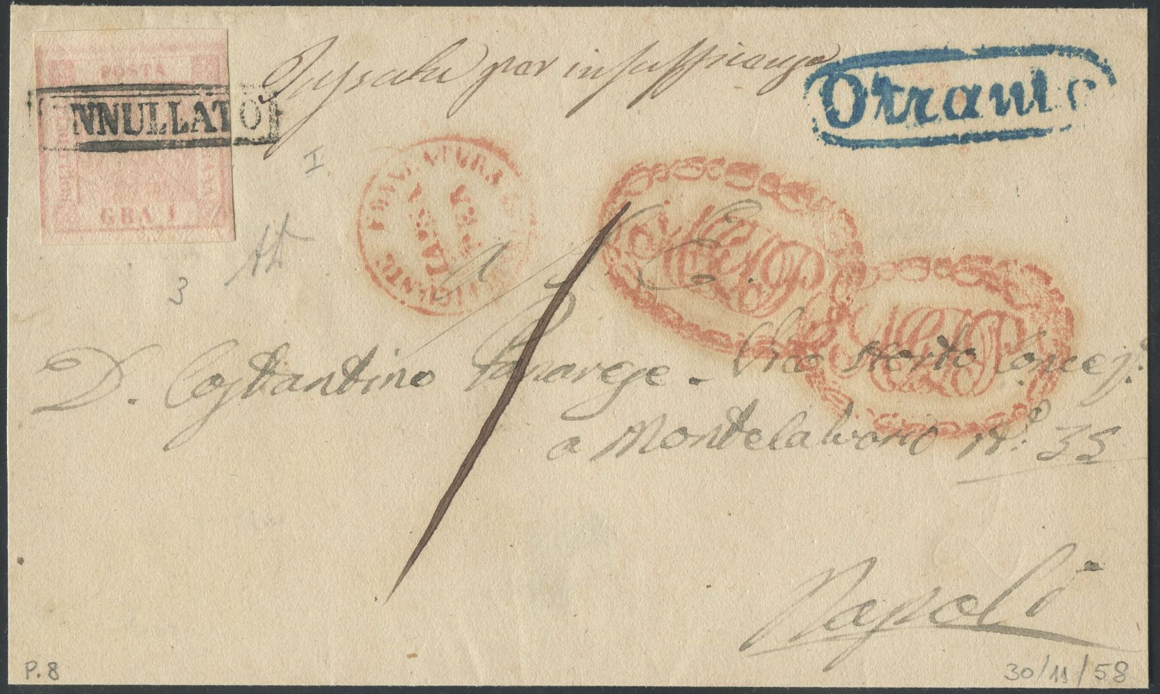 30.11.1858 - Busta da Otranto per Napoli affrancata tramite un 1gr. rosa chiaro n.3. Al recto della busta l'ovale di OTRANTO in azzurro (8pt.) (A+) (Alberto Diena)