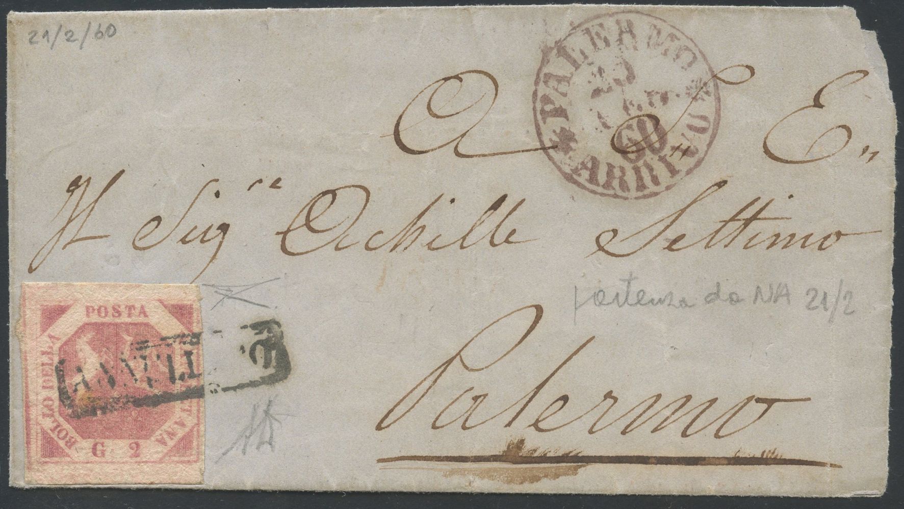21.02.1860 - Busta di piccolo formato da Napoli per Palermo affrancata tramite un 2gr. rosa carminio n.7c. (A+) (Bottacchi, Alberto Diena)
