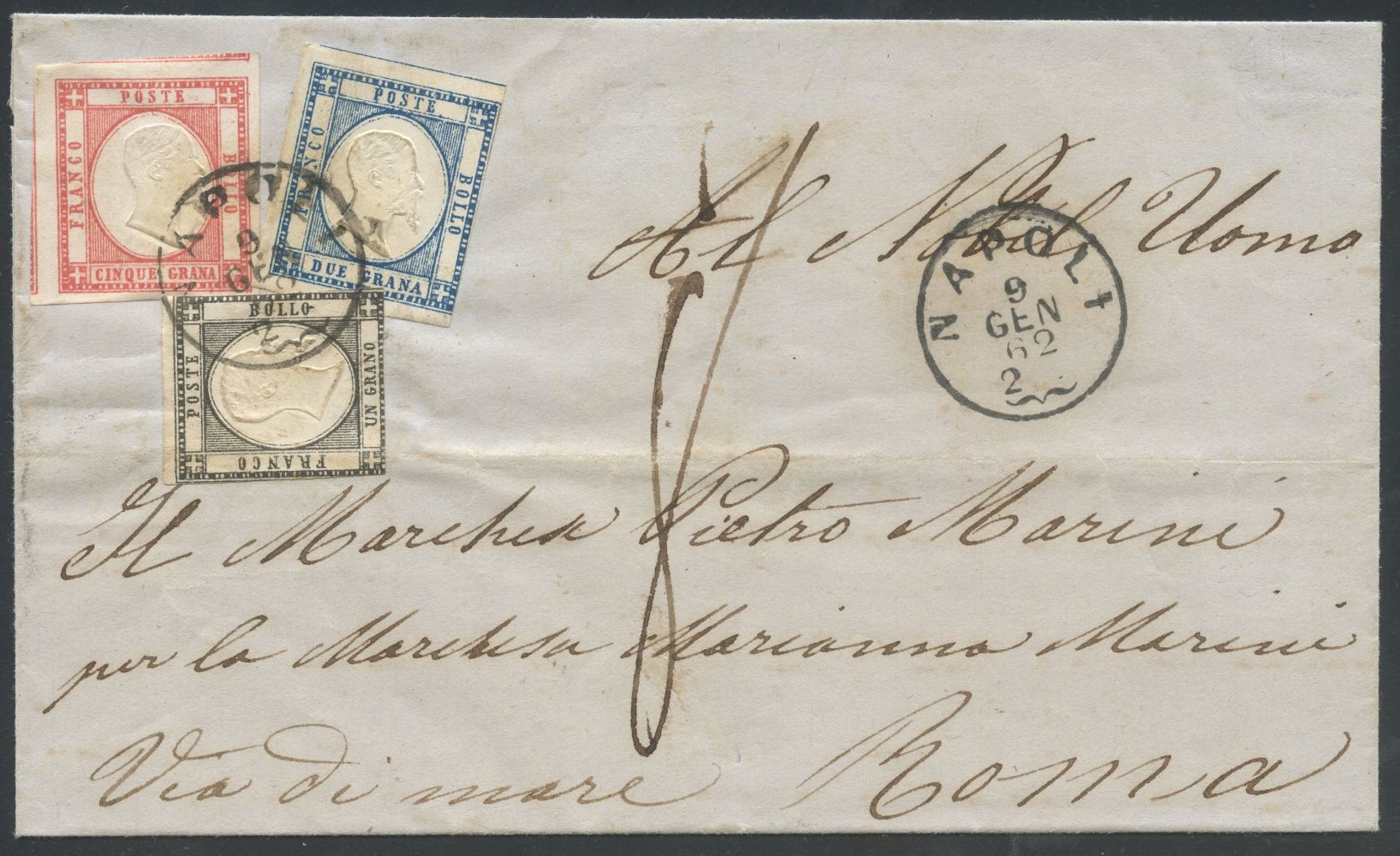 09.01.1862 - Lettera da Napoli per Roma affrancata per 8gr. tramite un'affrancatura tricolore 1gr.+2gr.+5gr. n.19,20,21. Alcuni difetti ma insieme non comune. (B)