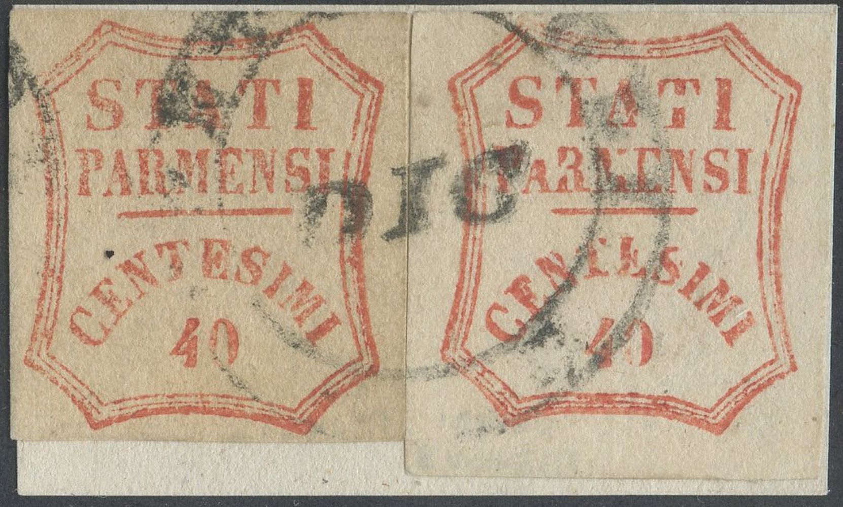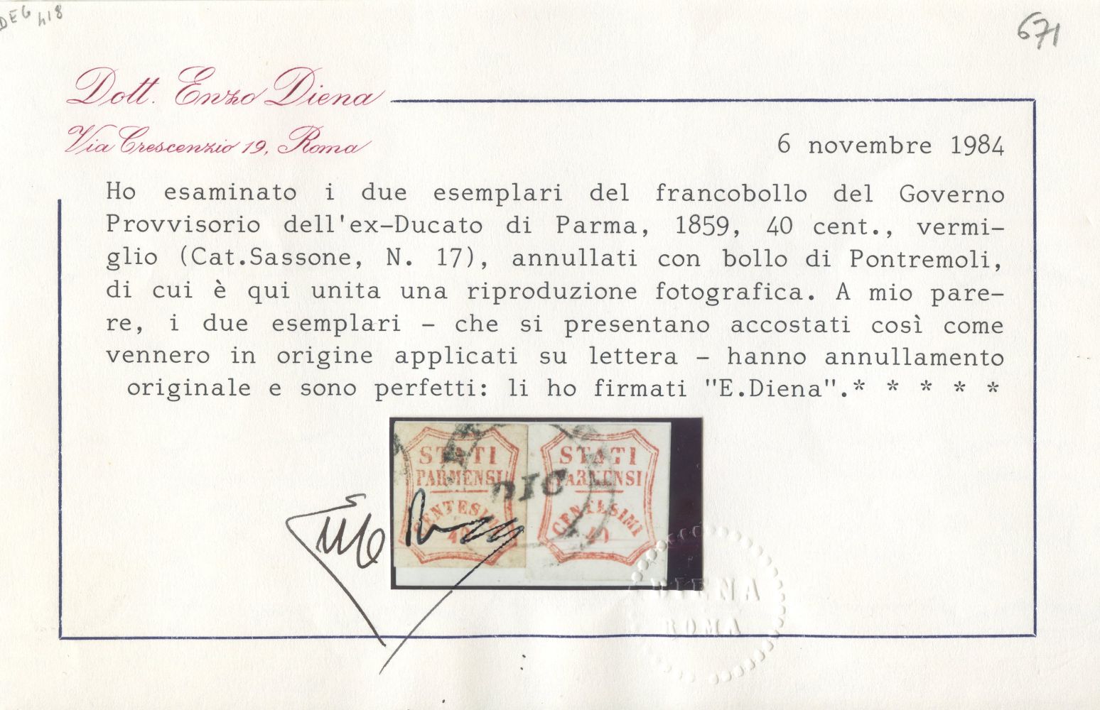 1859 - 40 cent. Vermiglio n.17 usati ed accostati come vennero usati in origine. Il valore di destra presenta la varietà costante '' Seconda T di STATI spezzata in alto '' (n.17+17c). Insieme estremamente raro e di ottima qualità. (A+) (cert. En. Diena, Emilio Diena per esteso su entrambi i valori).
