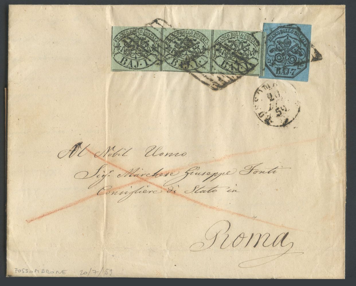 20.07.1859 - Busta da Fossombrone per Roma affrancata per 10 baj. tramite una striscia di tre del 1b. verde grigiastro n.2 + 7b. azzurro n.8. raro insieme.