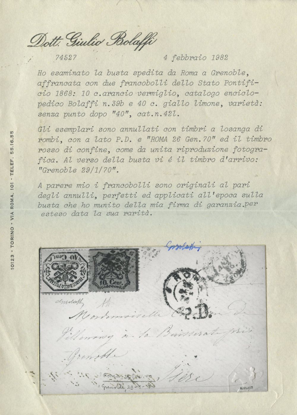 26.01.1870 - Busta da Roma per Grenoble affrancata per 50 centesimi tramite un 10 cent. vermiglio arancio n.26a + 40 cent. giallo limone senza punto dopo la cifra. (A+) (Alberto Diena, Cert. Bolaffi)