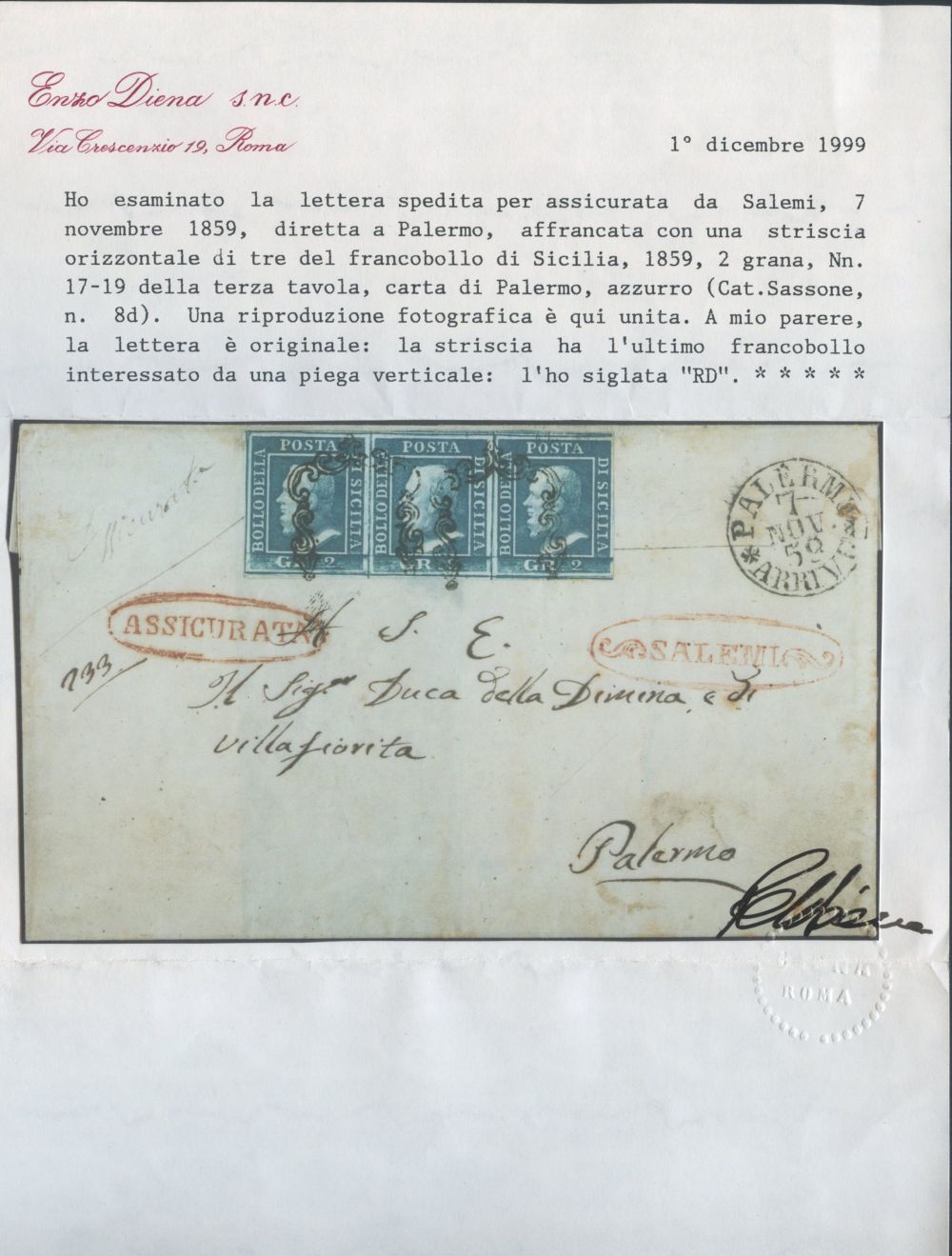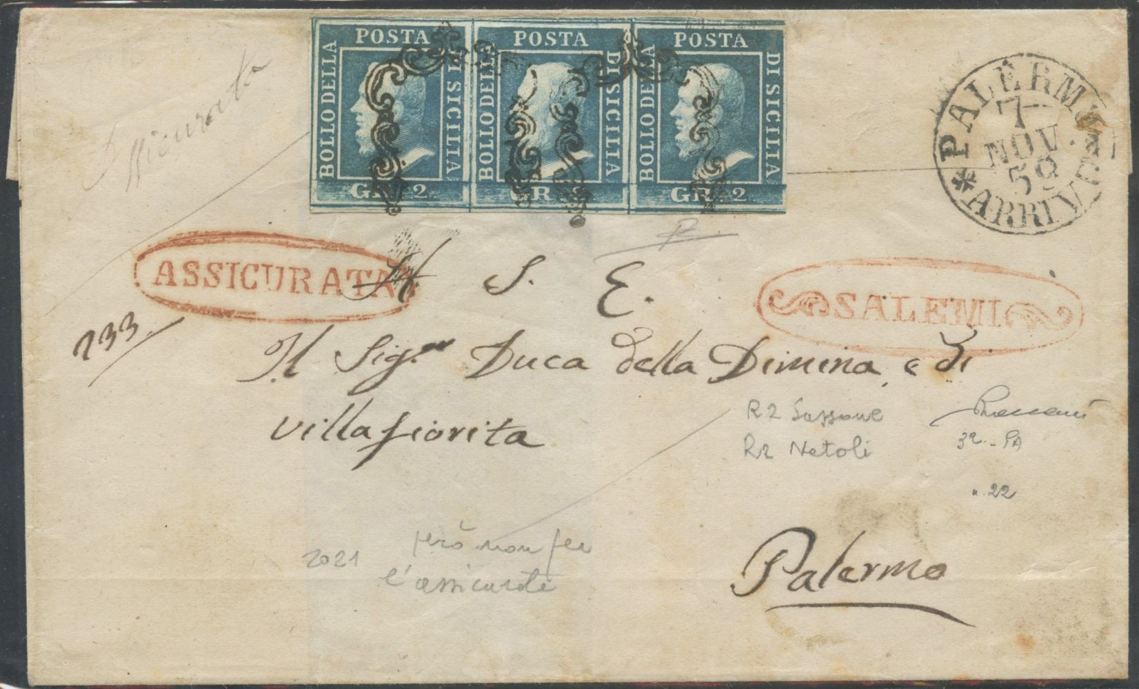 07.11.1859 - Busta assicurata spedita da Salemi per Palermo affrancata tramite una striscia di tre del 2gr. azzurro n.8d. Al recto l'ovale di SALEMI in rosso +  l'ovale ASSICURATA in rosso (pt.R2)