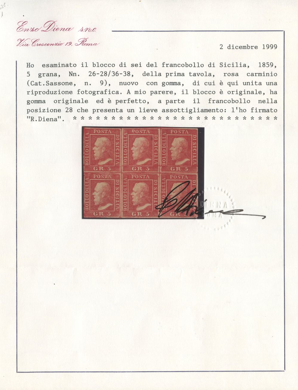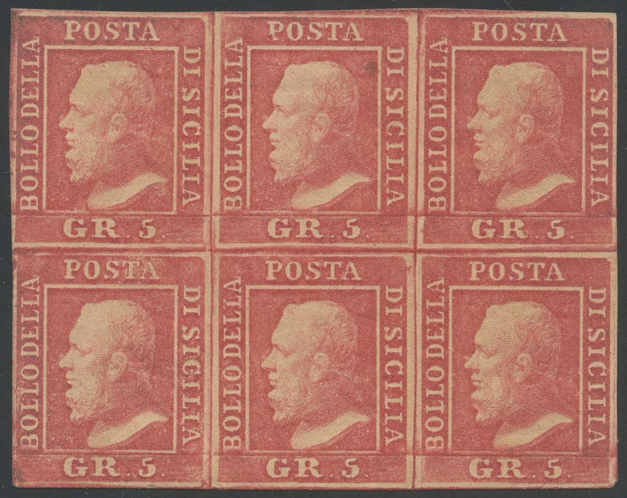 1858 - 5gr. rosa carminio n.9 in splendido blocco di 6 nuovo con gomma. Un esemplare con piccolissima trasparenza. (A-) (Cert. Diena)