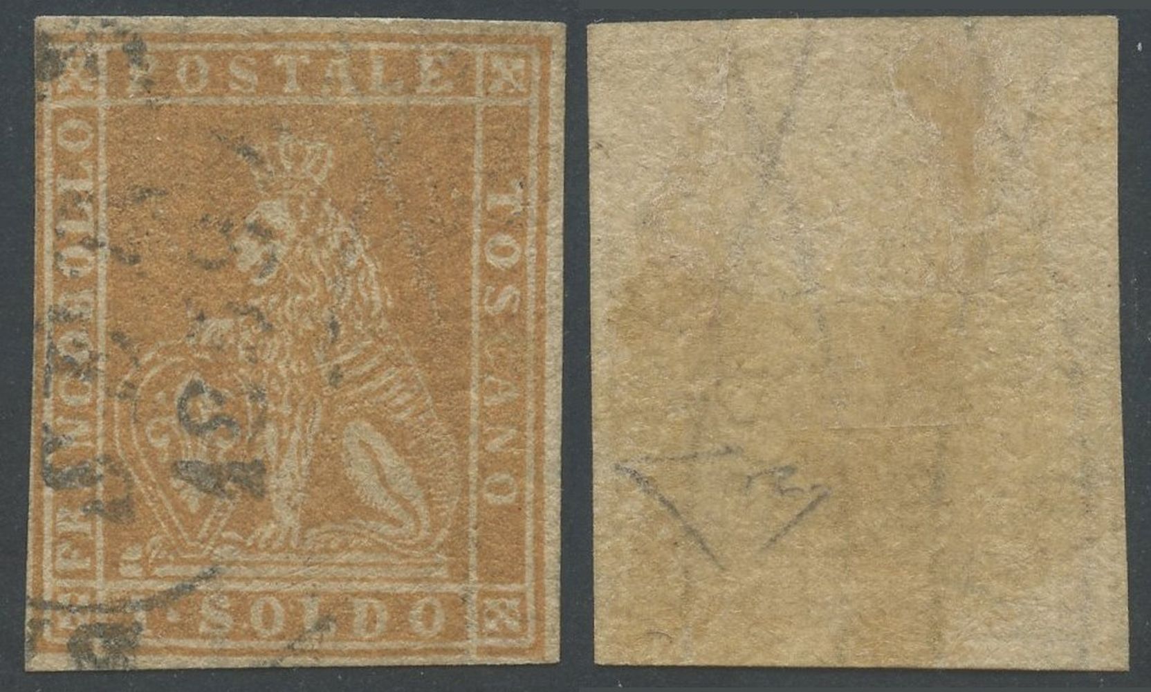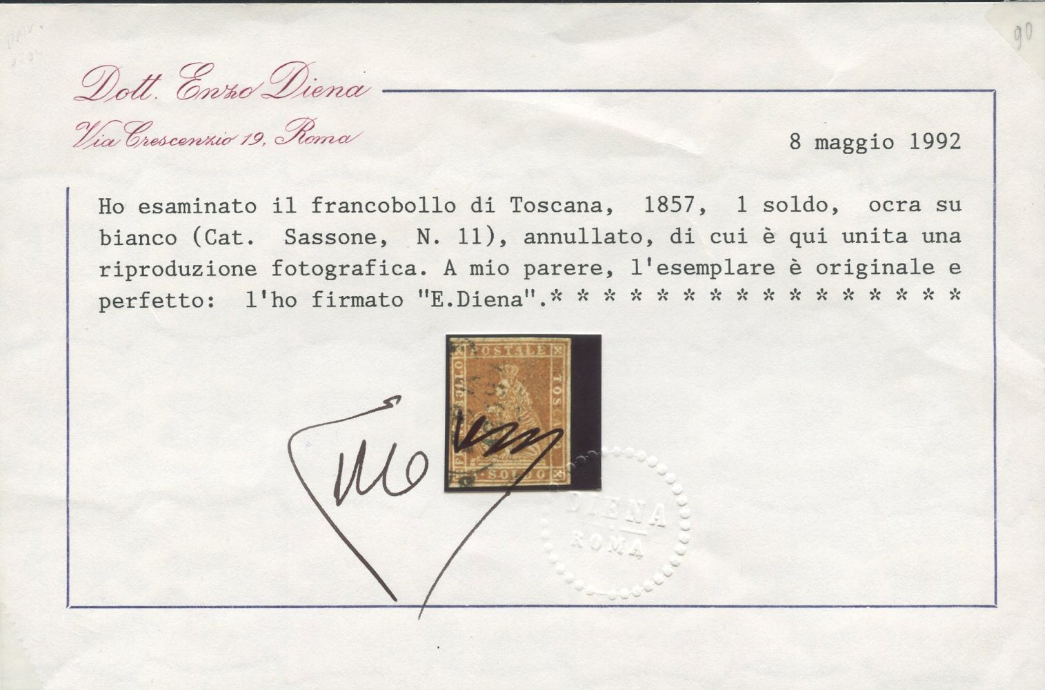 1857 - 1 soldo ocra n.11, filigrana linee ondulate, usato. (A) (Cert. Enzo Diena)