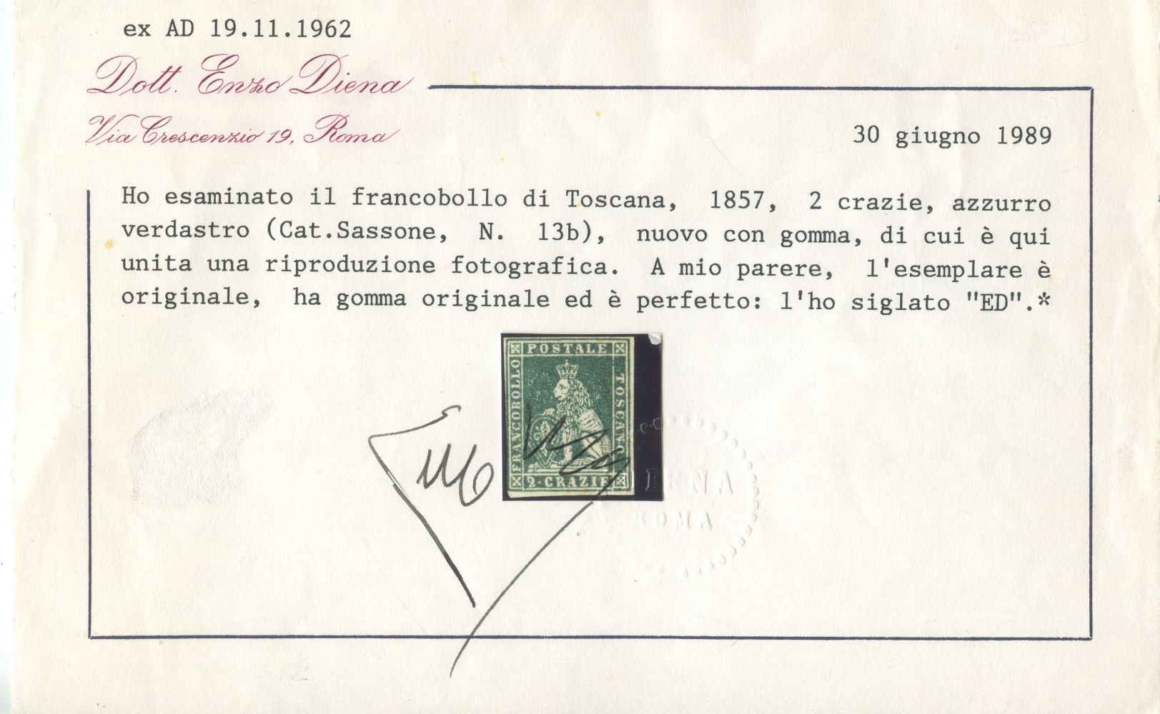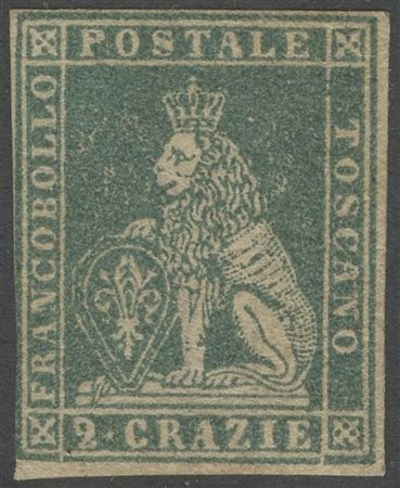 1857 - 2 cr. azzurro grigio verdastro n.13b, nuovo con gomma. A filo a sinistra, certificato come perfetto. (A-) (Cert. Enzo Diena)