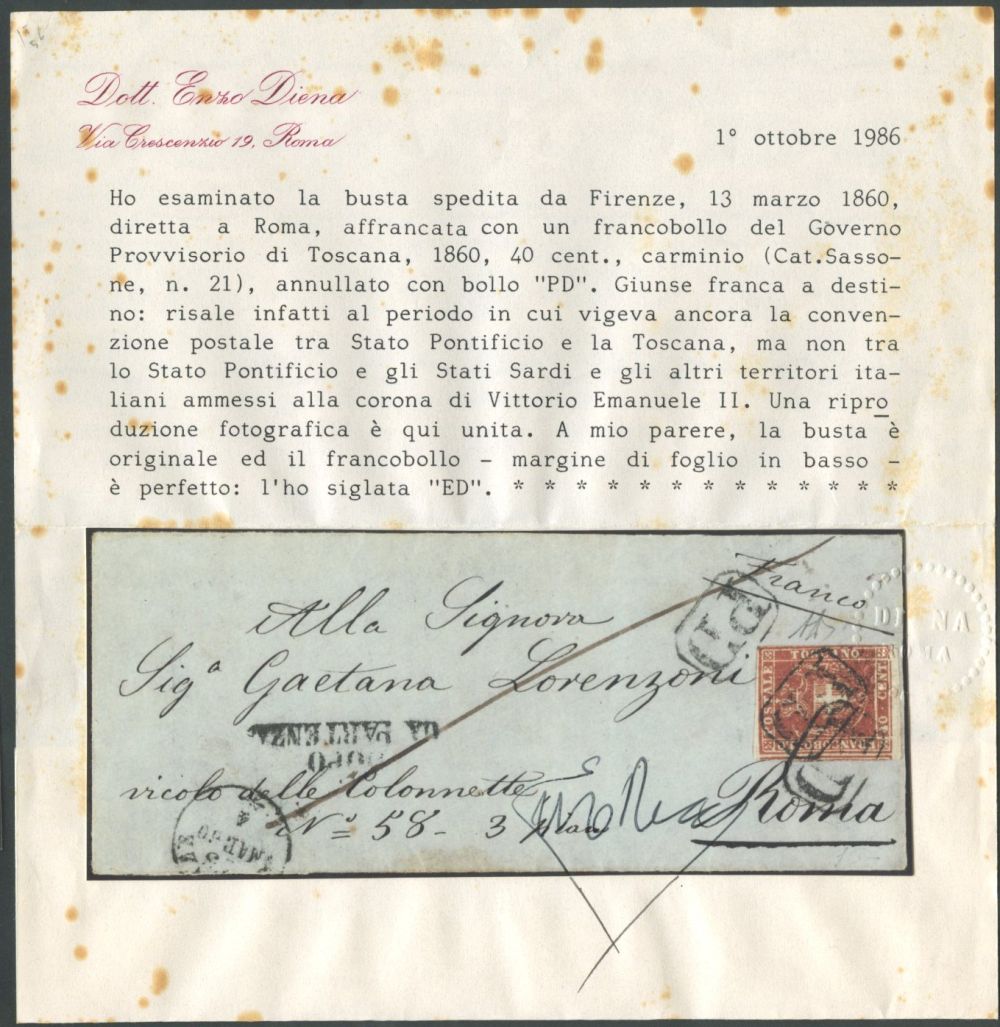 13.3.1860, Lettera da Firenze per Roma affrancata tramite un 40c. Carminio N.21. Tariffa di primo porto per la terza distanza Pontificia.(A) (A.Diena, Cert. En.Diena)