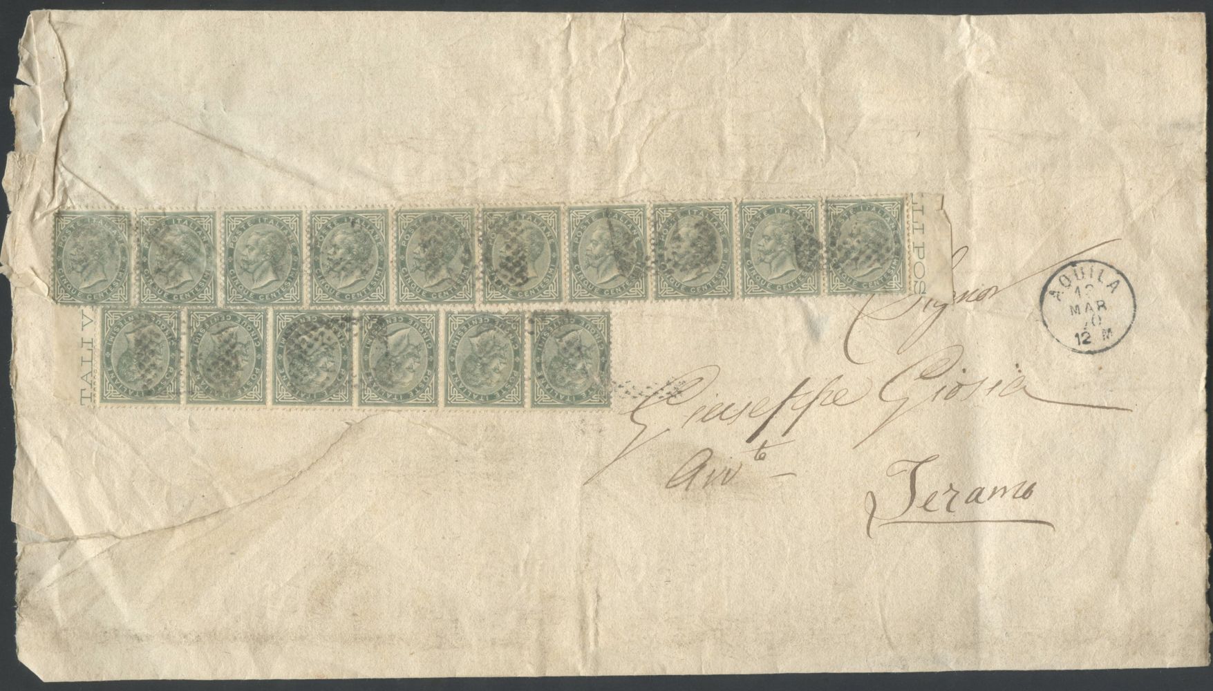 Busta di grande formato 27,5x15,5 Cmaffrancata per 80 centesimi tramite una striscia di 10 del 5c. N.T16 (massima striscia orizzontale possibile) + una striscia di 6 dello stesso valore. Insieme raro.