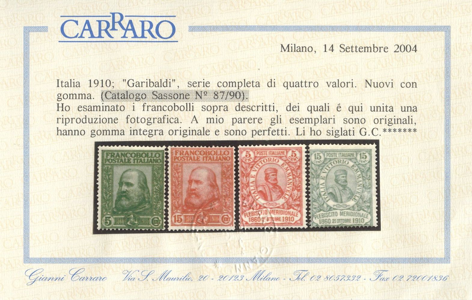 1910 - Serie Garibaldi n.87/90 nuova con gomma integra. Cert. Carraro