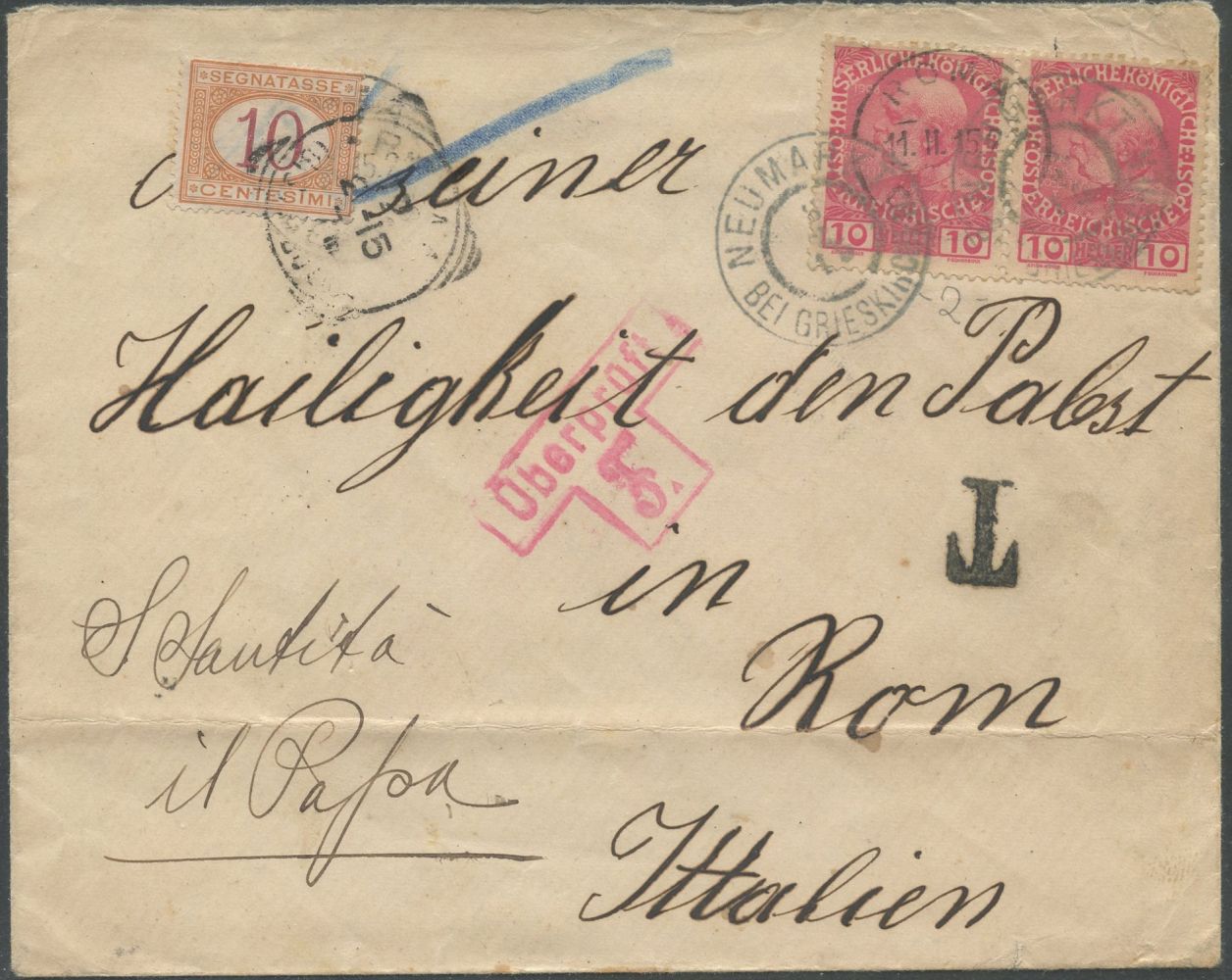 11.11.1915 - Busta spedita dall'Austria ed affrancata in partenza per 20 Heller e tassata per 10 cent. in arrivo in Italia. Non comuni le lettere indirizzate al Papa.