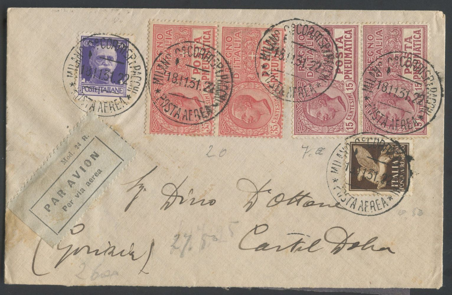 18.11.1931 Busta da Milano per Gorizia viaggiata per via aerea affrancata per 2 Lire tramite 50cent. imperiale n.251 e P.A. n.11 + posta pneumatica n. 12 e n. 13, entrambi in coppie verticali.